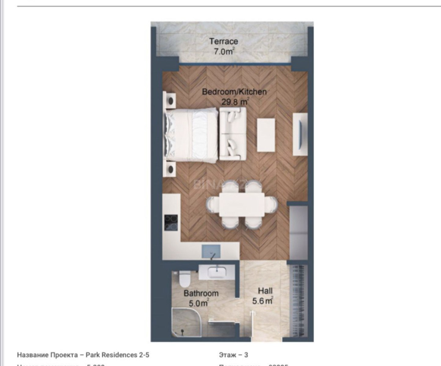 - Layihə: zal + mətbəx studiya, ayrıca yataq otağı, sanitar qovşağı, eyvan