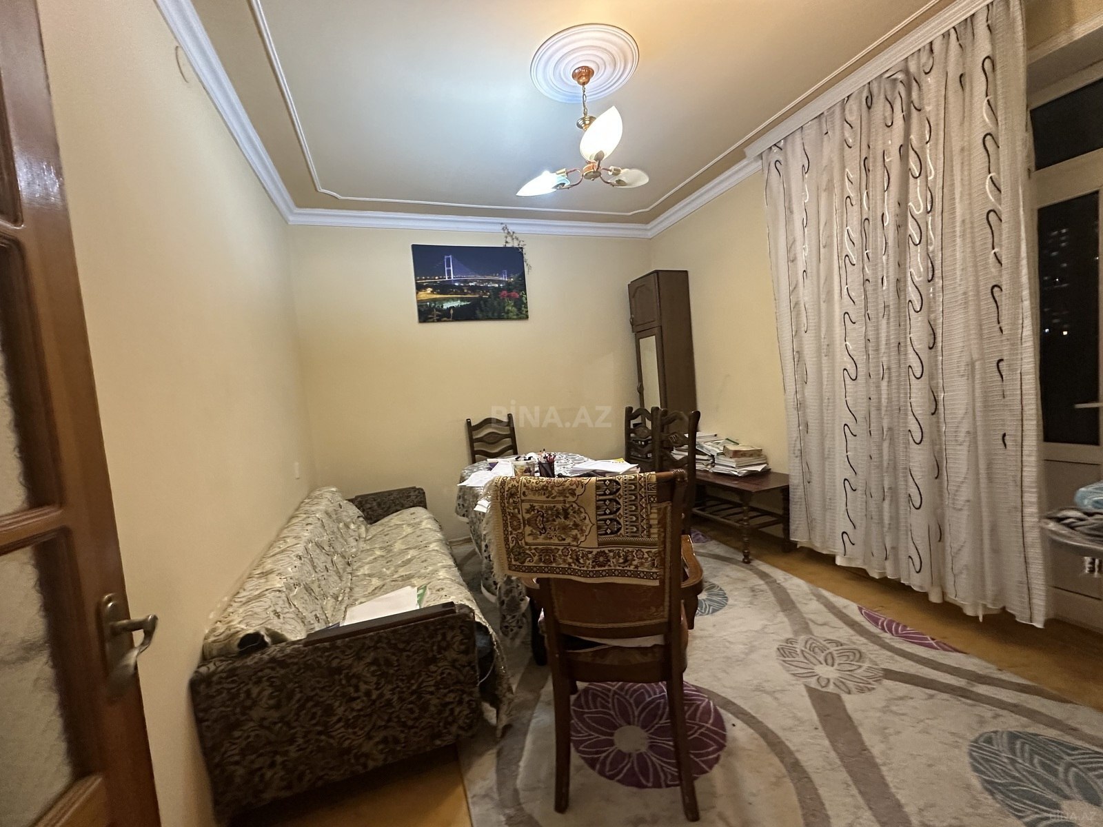 - Divar kağızı ilə örtülmüş otaqlar, pəncərə və pərdə dəstləri.