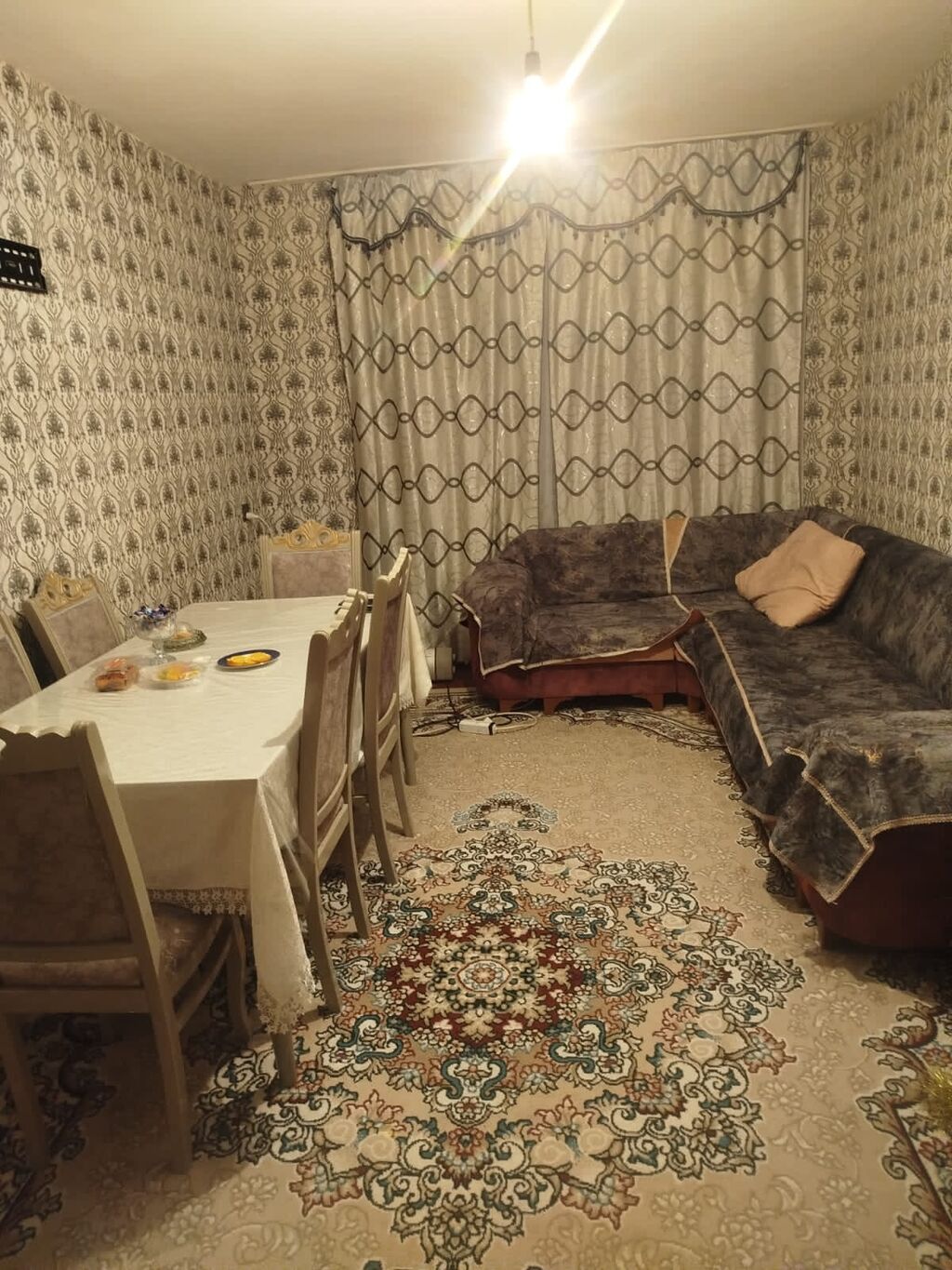 - Geniş qonaq otağı: künc divan dəsti, pərdə və tül, yemək masası və 6 ədəd stul, xalça.