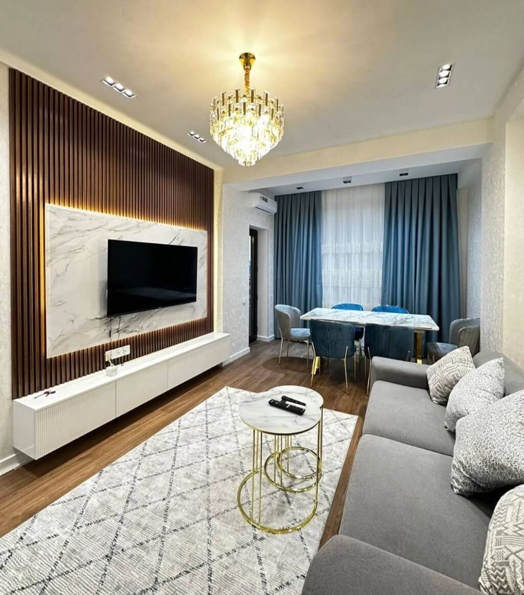 - Zövqlü interyer: mərmər teksturalı TV bölməsi, taxta lamellər, LED işıqlandırma