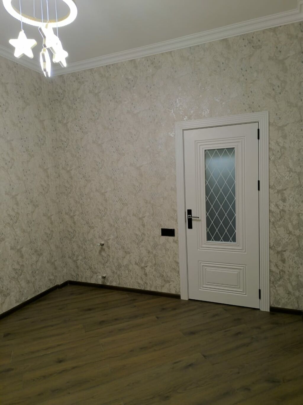 - Geniş, işıqlı otaqlar: Açıq rəng divar kağızları, yuxarı səthlərdə ağ tavan və klassik plintuslar. LED asma işıqlar (üzük və ulduz fiqurlu dekorativ lüstr) ilə zövqlü işıqlandırma.
