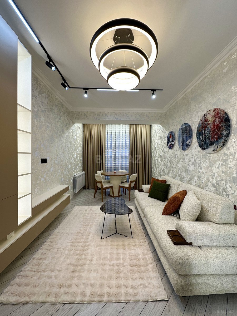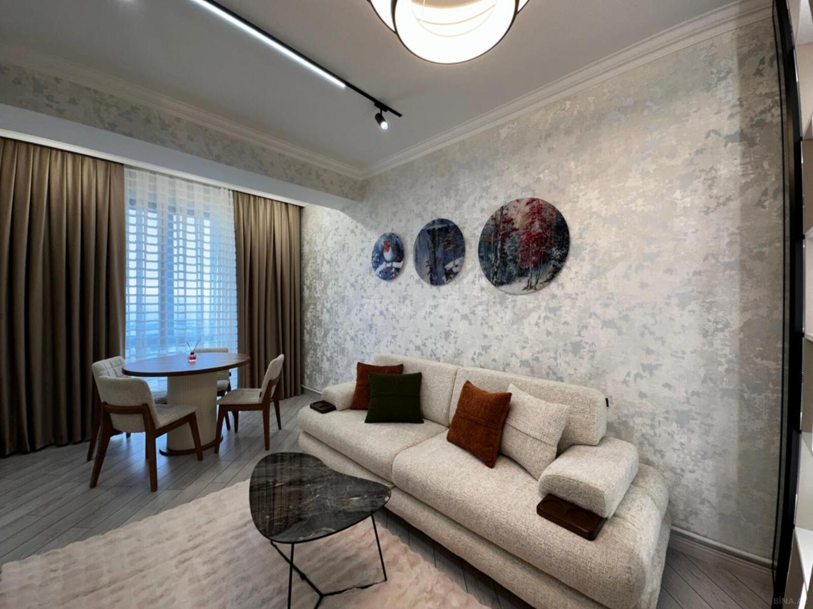 Yeni tikili kompleks, həyəti və yeraltiqarajı olan, yeni keyfiyyətli təmir, yaşayış olmayan, gündüşən mənzil və tam əşyalı