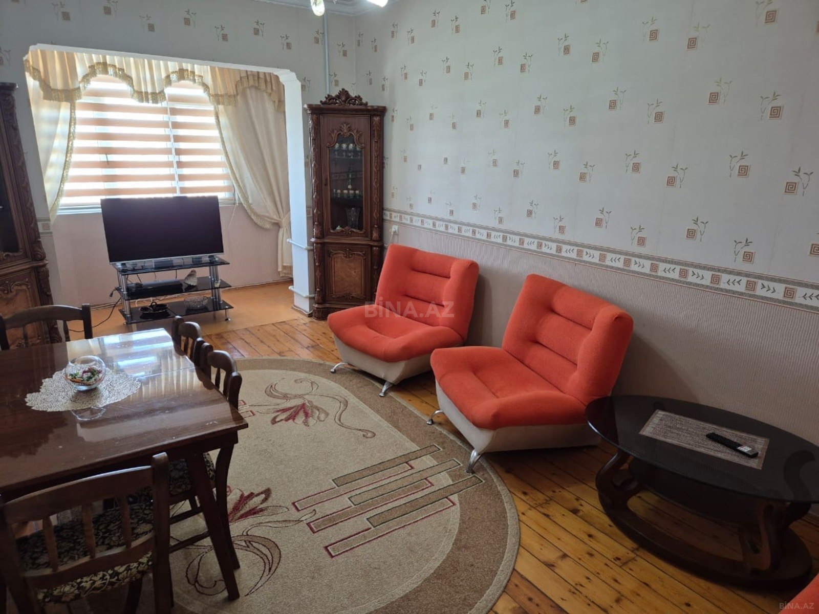 - Qonaq otağında böyük vitrindən ibarət klassik mebel dəsti və nahar masası yerləşir.