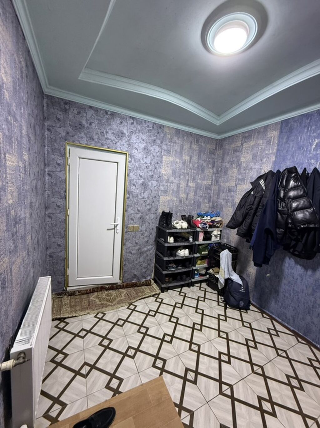- Giriş/hol: tavan işıqlandırması, radiatorla isitmə, naxışlı kafel döşəmə, paltar asqısı və ayaqqabı rəfi üçün yer.