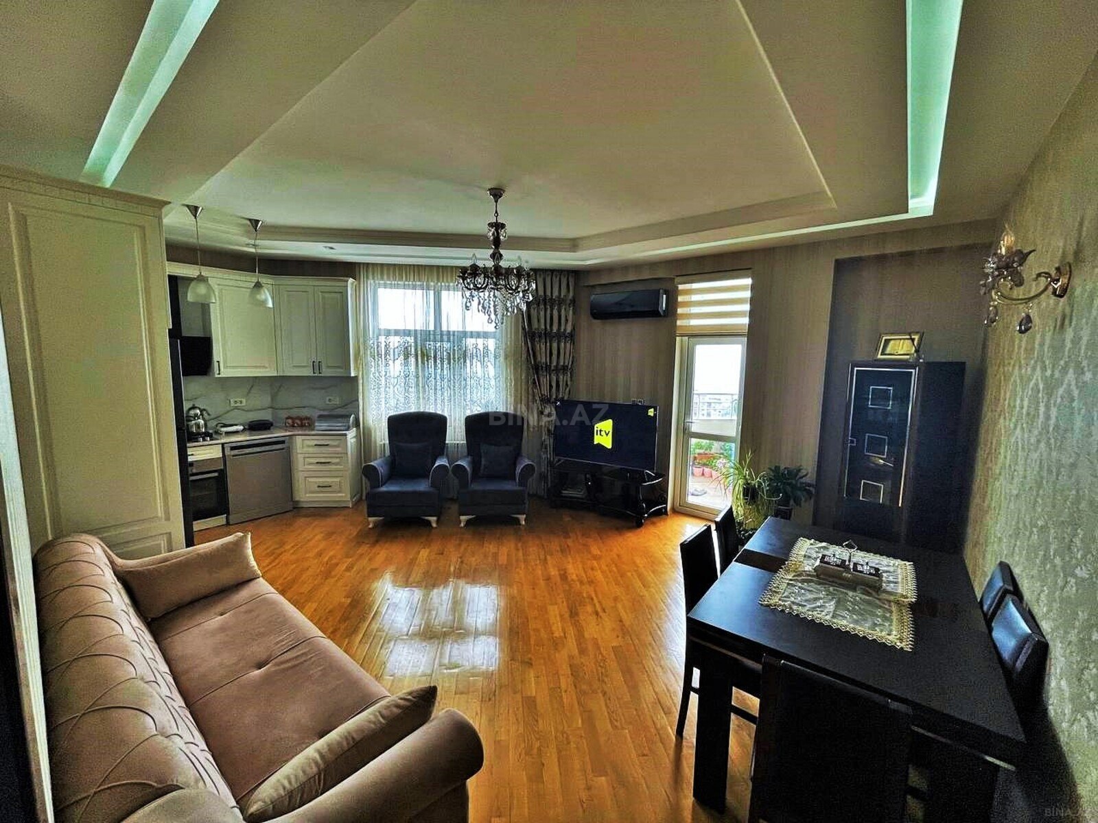 - Planlama: böyük zal, geniş dəhliz, ayrıca otaqlar. Zal açıq konseptlidir, TV stendi və vitrin rəflərlə təchiz olunub, balkon/eyvana çıxış var.