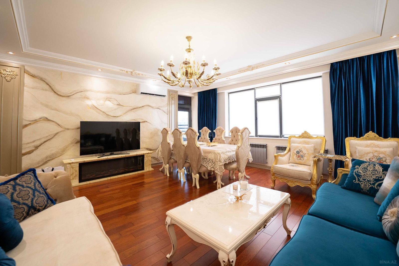 - Klassik üslubda, işıqlı və hündür tavanlı böyük zal: kristal çilçıraq, dekorativ divar kağızları, parket döşəmə