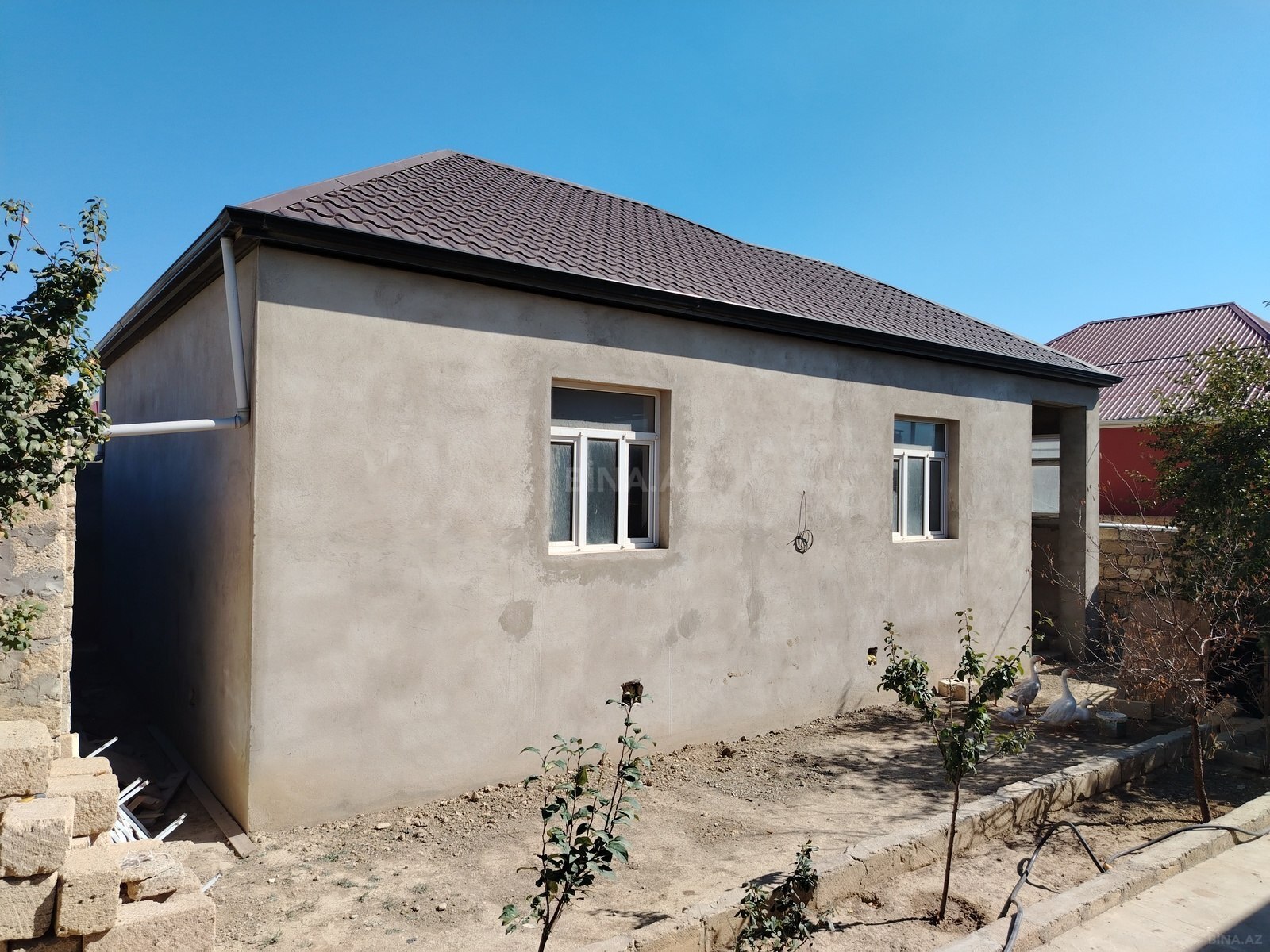 - Fasad: Mavi rəngli suvaq, dekorativ pervazlı plastik pəncərələr, səki daşlı həyət, pilləkənli giriş, qapalı eyvan/sundurma