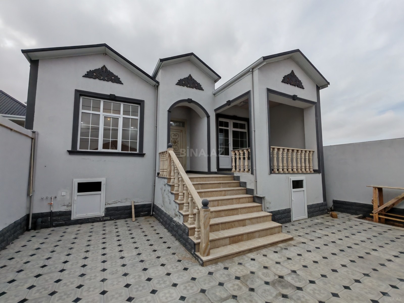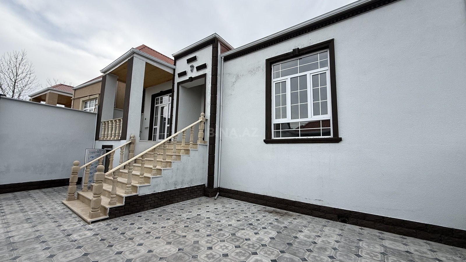 - Ön fasadda sütunlu və məhəccərli veranda, pilləkənli giriş
