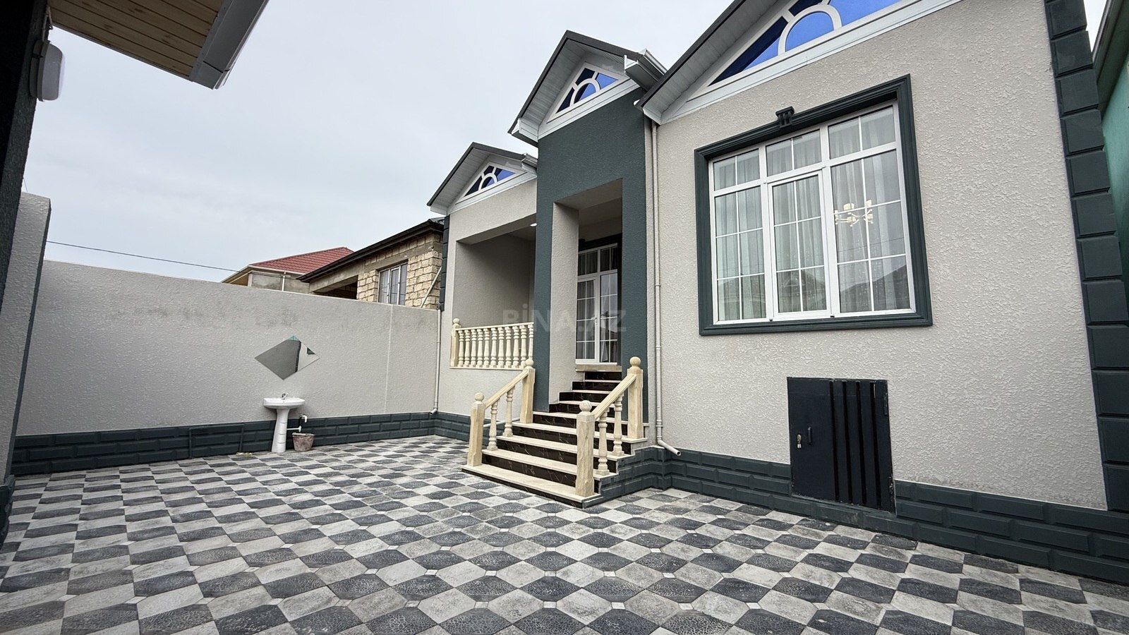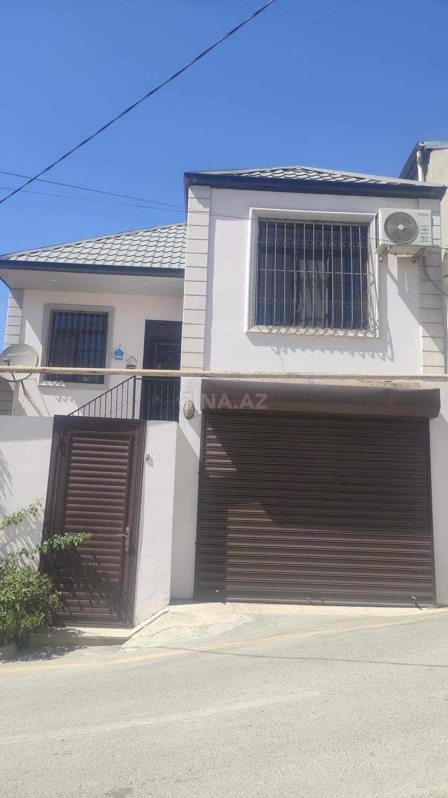 - Beton/daş konstruksiya, suvaqlı fasad, metal giriş qapısı