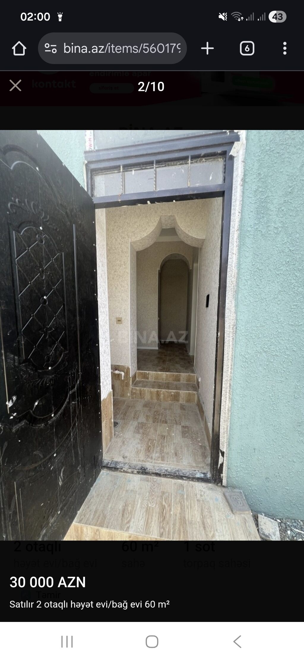 Binə salxoz İmam Həsən məsçid ərazidə yola yaxın 5 otaqlı 11 daş üstündə altı qaraj ev satılır təmir yoxdur.pol patoloq vurulub qapı var.şəx yaşayış üçün tikilib makler evi deyil.ümumi torpaq sahəsi 2 sot.