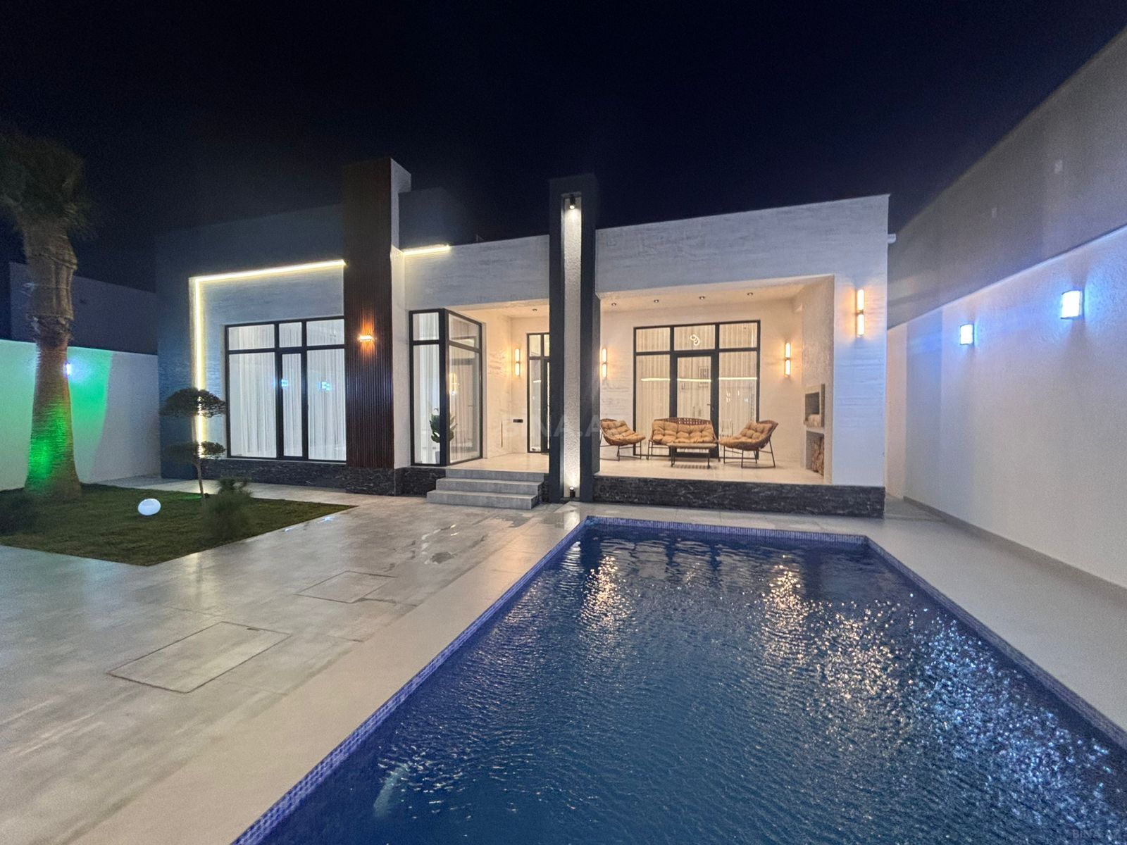 Villanın 2 sotdan ibarət həyətyanı sahəsinə qaraj, terras və isti döşəməli nəzarətçi otağıda daxildi,