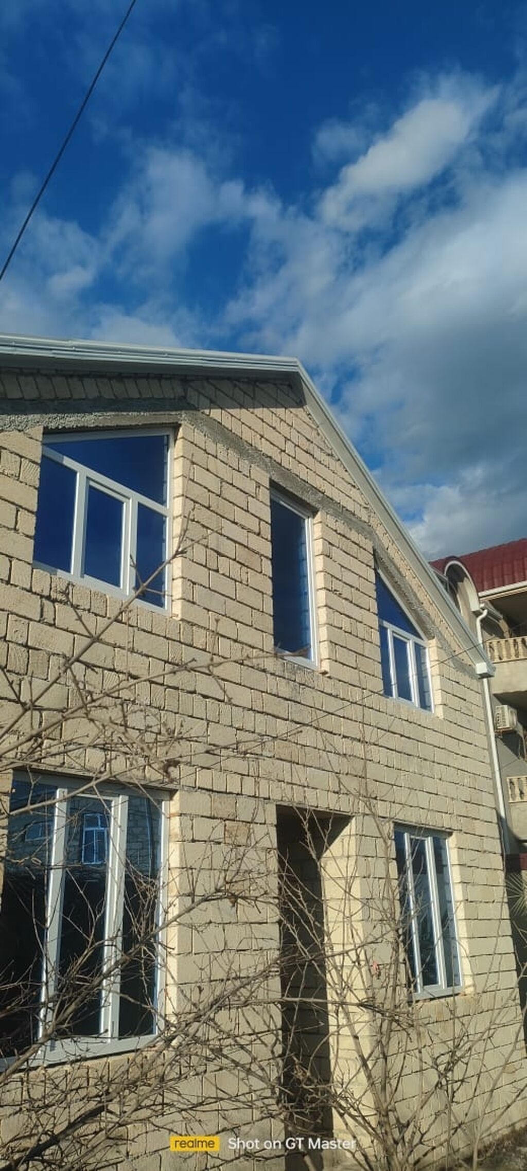 - Pəncərələr: ağ PVC plastik paket, geniş vitrajlı açıqlıqlar; ikinci mərtəbədə üçbucaq formalı mansard pəncərəsi.