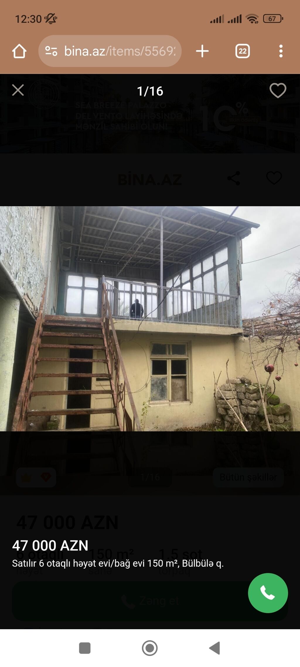 Xəzər rayonu Mərdəkan qəsəbəsi villalar olan mehellede Dalan 1 den iceri Ibo marketden iceri 5 sot torpaq sahəsində inşa edilmiş 1 mərtəbəli bag evi satılır.Umumi sahəsi 170 kvmdir.holl, 1 zal , 3 yataq otağı, mətbəxi, 2 sanuzeli mövcuddur.Heyetinde hovuz, manqalni,2 masinli qaraj,bisetka,sanuzeli, dekorativ ağacları, işıqlandırma sistemi,distansiyonu qapısı var.Qazi, işığı, suyu ,daimidir.Etrafli məlumat almaq üçün bizimlə əlaqə saxlayın.Sened Kupca