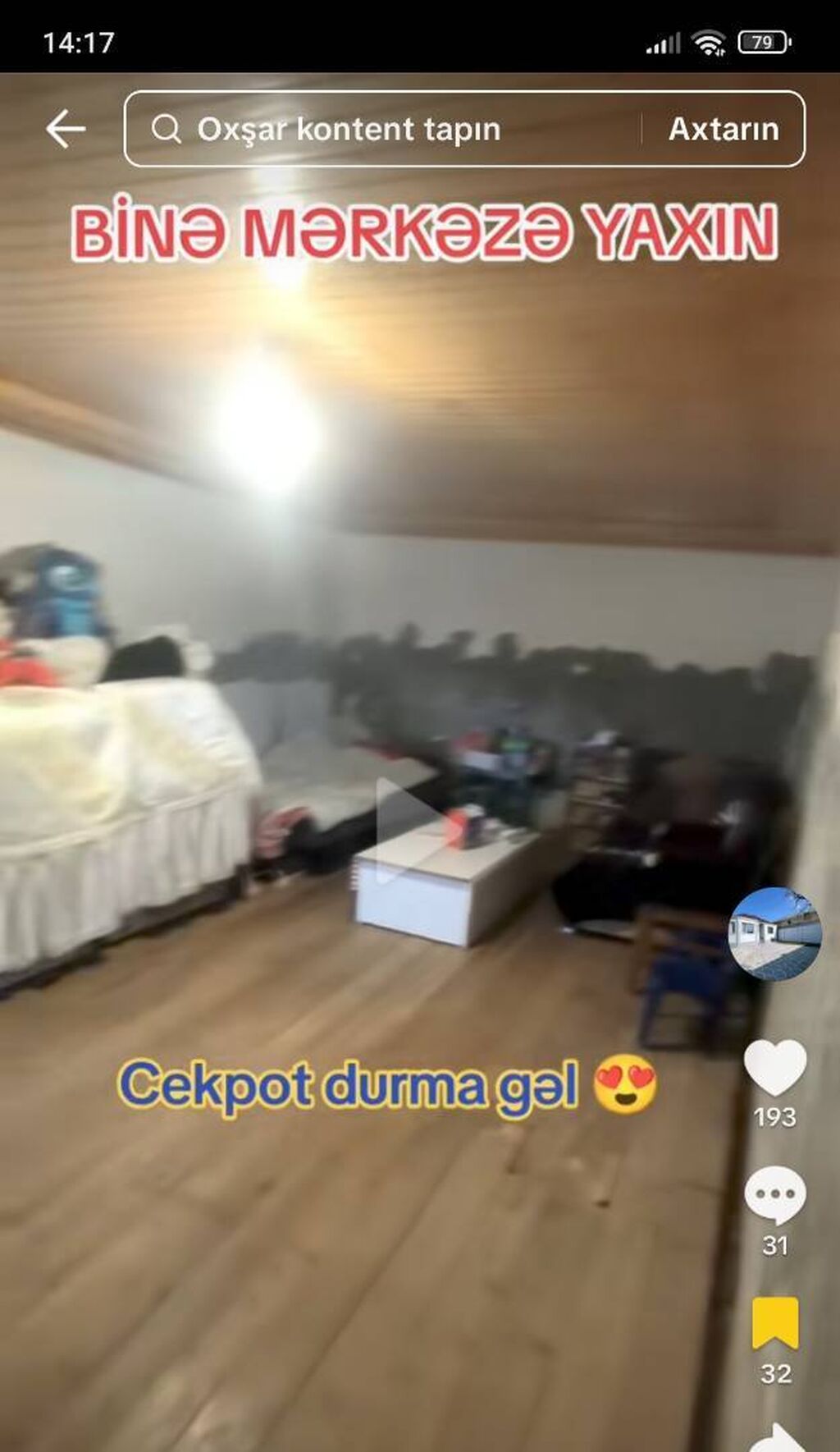 Ünvan Xəzər rayonu Binə savxozu məsçidin yanı pekarniya gedən asvalt yolun üstündə yaxınliqda idris inşaat yeni market araz market aptek ruzi marlet oba market məktəbə baxçaya 5 dəqiqəlik yoldur.