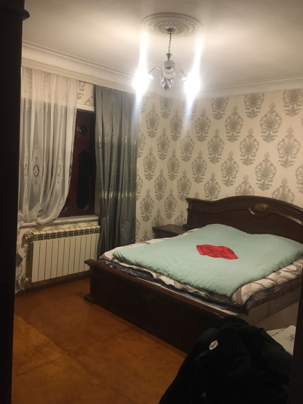 - Yataq otağı: taxta tavan, çoxlu spot işıqlandırma, böyük pəncərə və radiatorlu isitmə