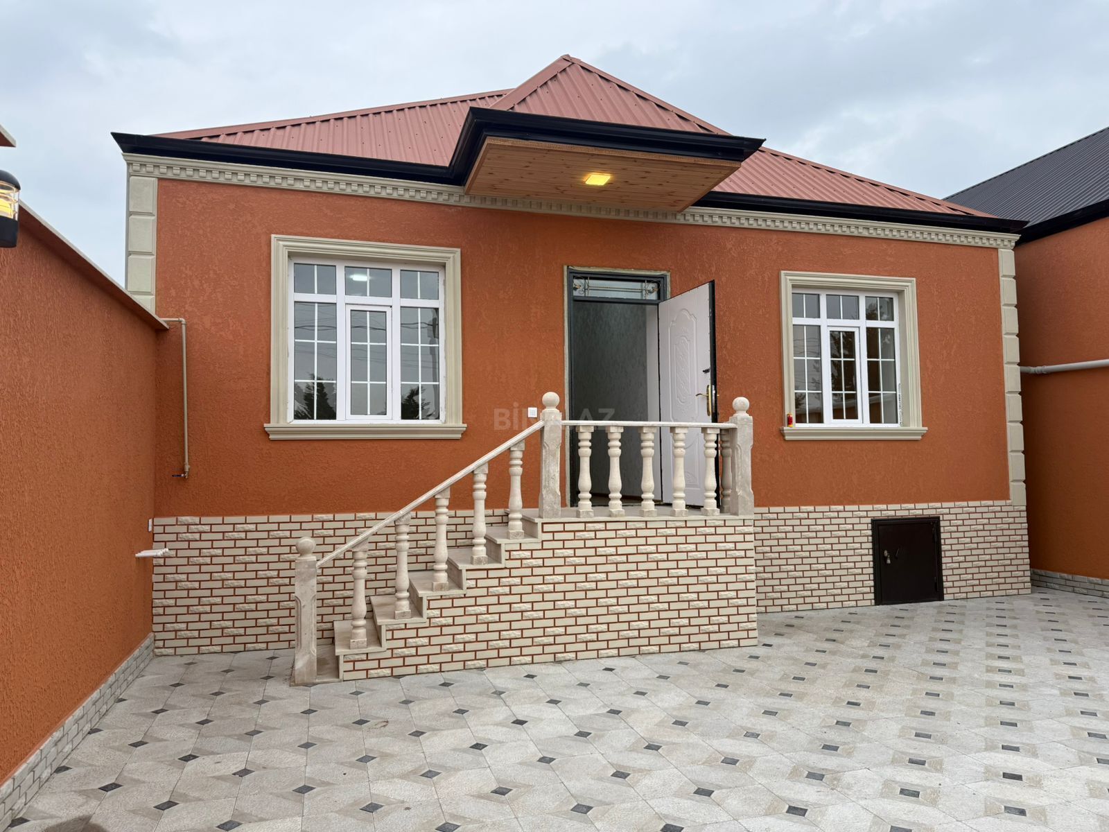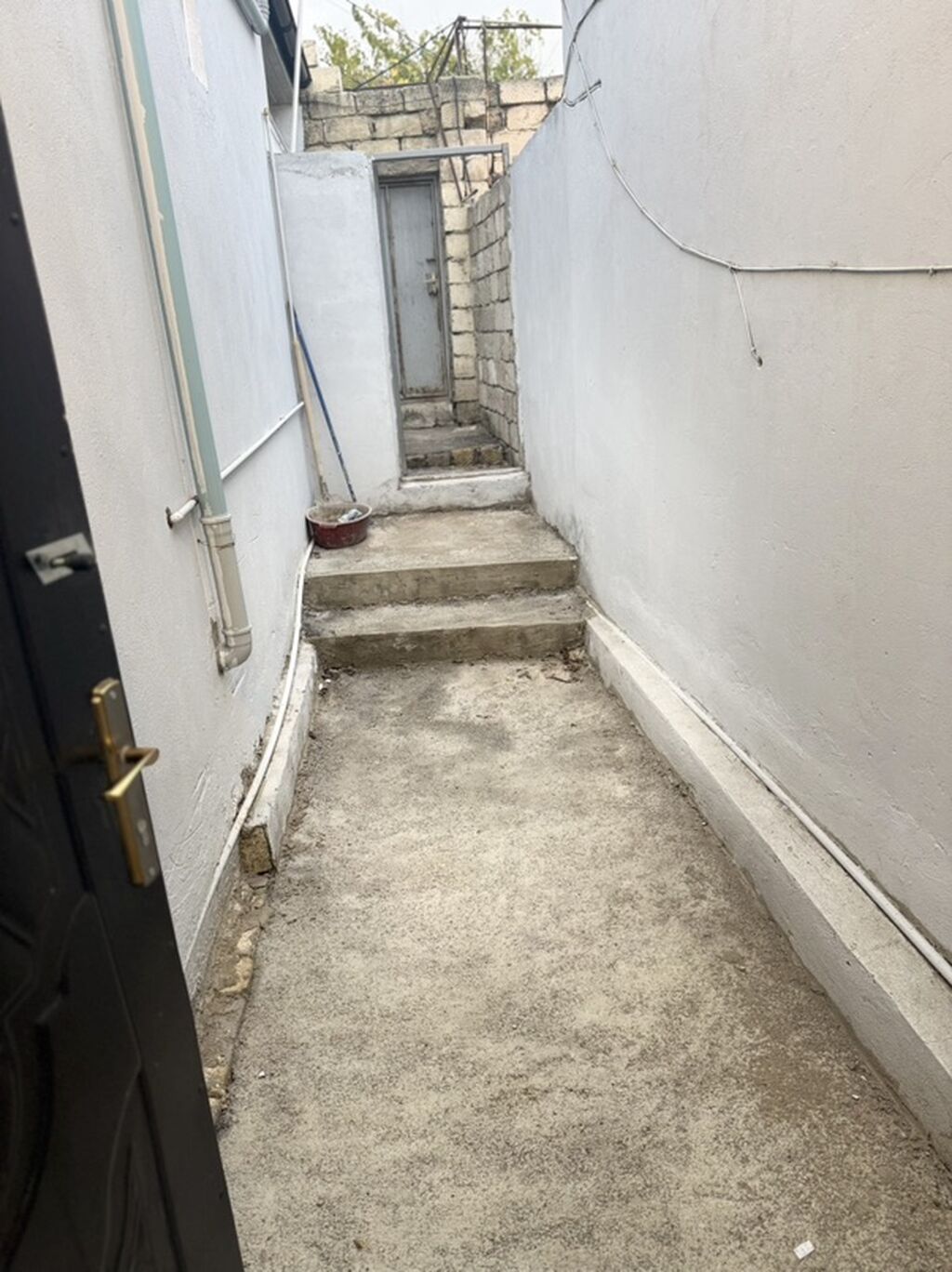 - Plan: 3 ayrı otaqdan ibarət, girişdə dar kombinə edilmiş keçid və pilləkənli həyət hissəsi