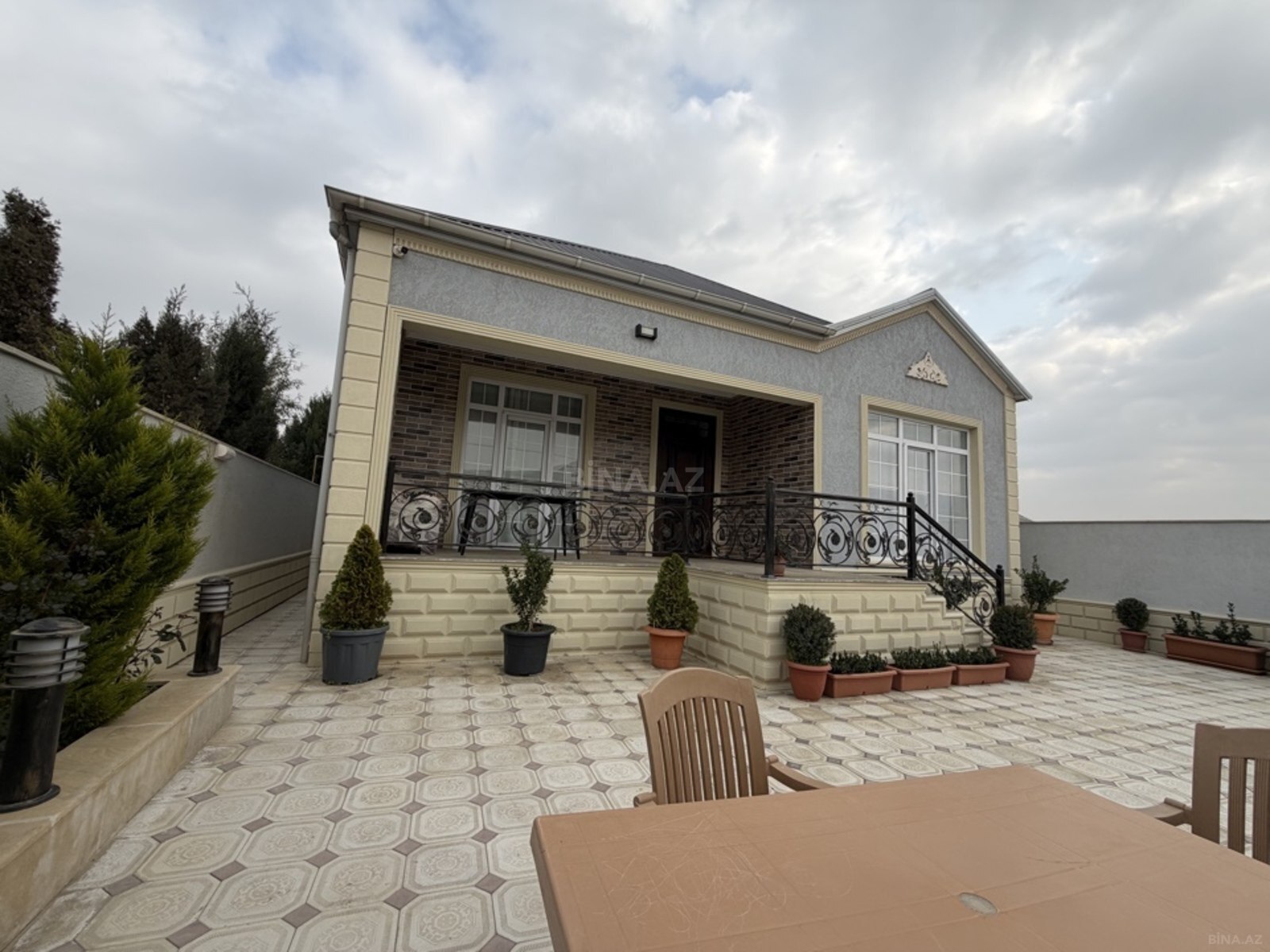 Tecili!!! Merdekenda bag evi satilir 7 sotda,Ümumi sahəsi 250kv, 5 otaqdan ibaret,1-zali,4 yataq otagı 3-sanuzeli,hündür tavanlı, zövgle temir edilib, istilik sistemi kombı, keyfiyyetli tikinti materiallarından istifadə olunub,Yay metbexi,besetkası,