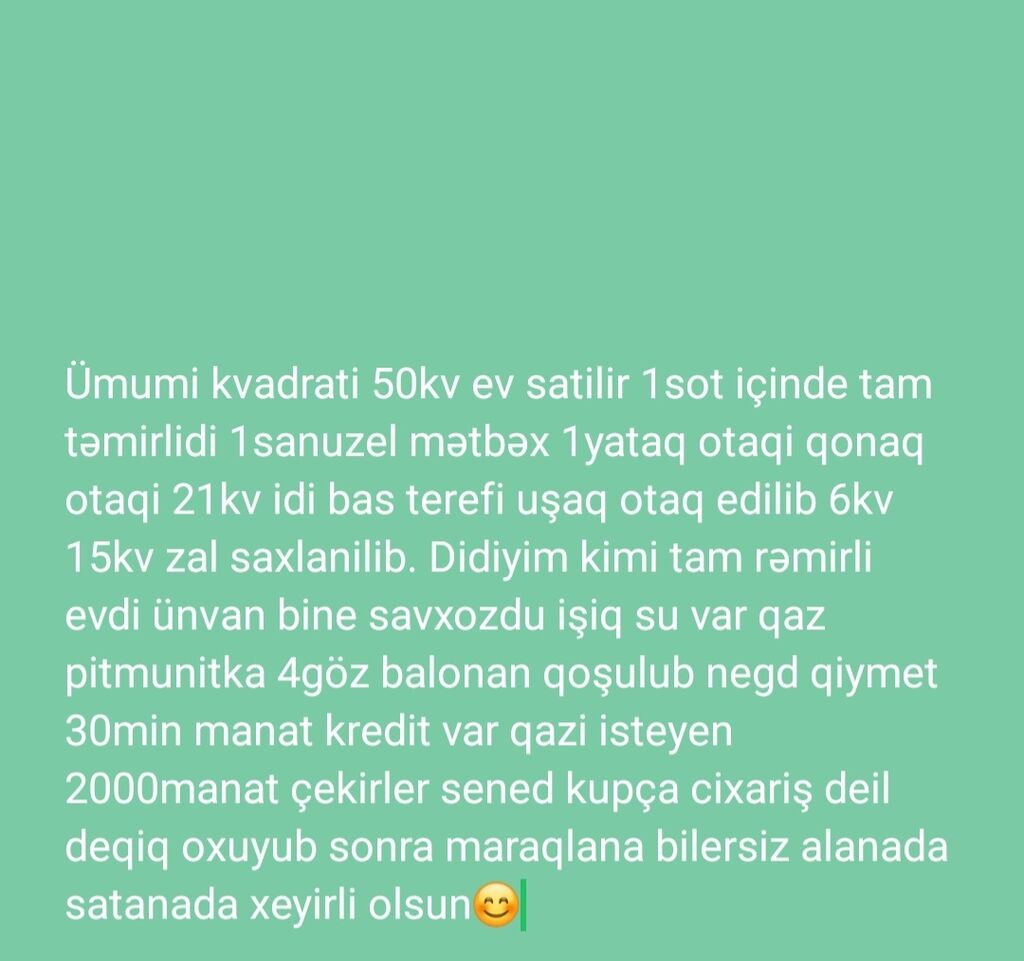Küçə asfalt işıqlı,ballı,oba restoran,dükan yaxın,315 nli məktəb 20 metrliyində,dayanacaq küçənin başında 50 m,həyətdə ağaclar nar,əncir,tut,alça,yapon alması,qarağat,xurma və sair.həyətdə şəlalə sistemi var qurulmayıb.su,qaz,işıq,daimi sayğacları var.hal hazırda öz ailəmlə yaşıyıram.ev tavanı hündür geniş otaqlardı.ikinci mərtəbədə əlavə balkonları var,hər mərtəbədə tuvalet hamamı var.tikilişi şəxsi yaşayışı üçün tikilib.beton yola 200 m şəhərə aeroporta və sair probkasız tez zamanda çatmaq olur.evi maddi vəziyyətimlə bağlı satıram.birdə kurs bağca və sair kimi istifadə etmək olar təklif gəlmişdi qəbul etməmişdim