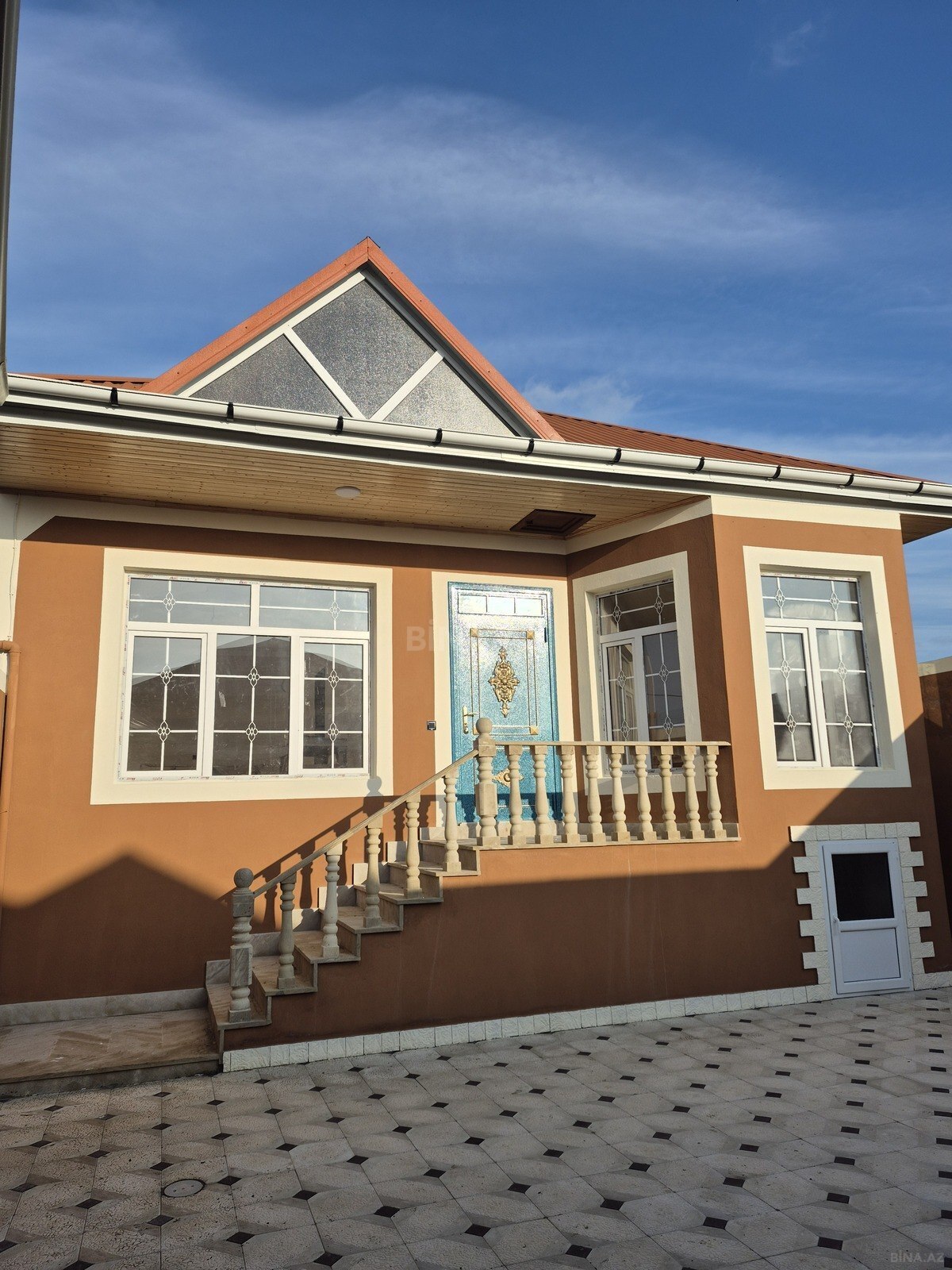 - Əsas tikili: birmərtəbəli fərdi ev, klassik fasad, yaşıl metalkirəmit dam, eyvanlı giriş