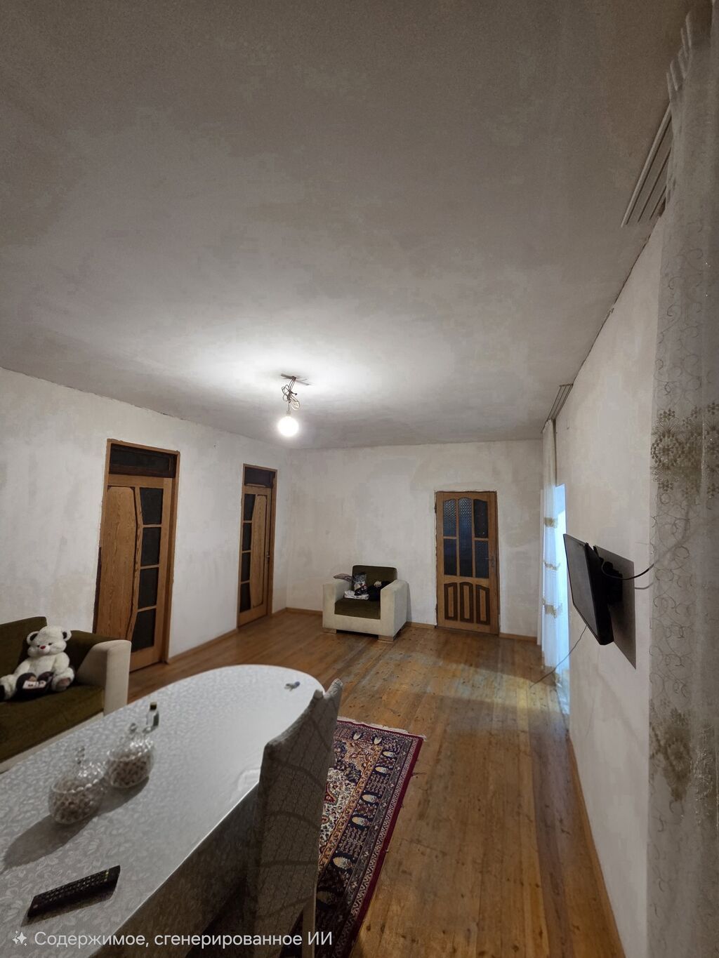 - Qonaq–yemək otağı: masa və 4 stul, pərdəli geniş pəncərə, divar kağızı, döşəmədə xalça