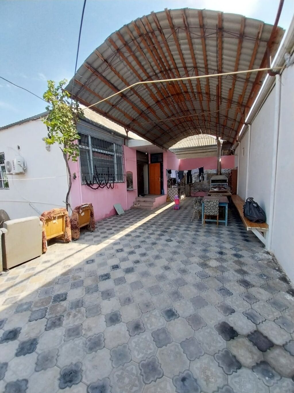 - Geniş, tam daş döşəməli həyət. Hündür, taxta karkaslı və profil dayaqlı metal dam örtüyü ilə böyük səligəli darvazaaltı/maşın dayanacağı.