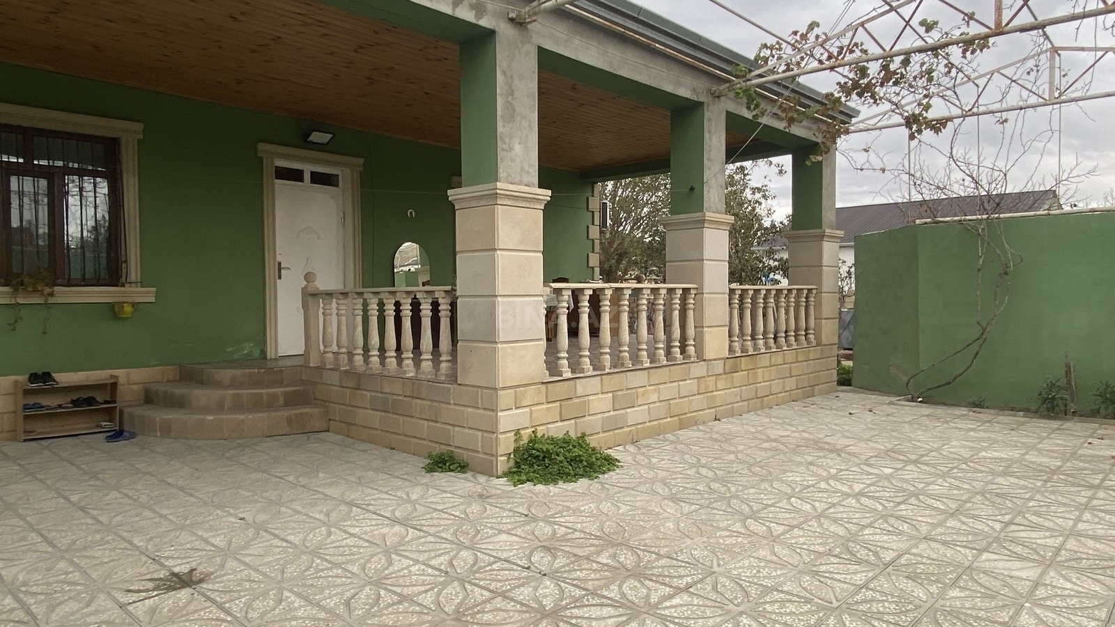 Həyətyanı sahə genişdir, ağ daş hasarla tam məhdudlaşdırılıb və iri darvaza quraşdırılıb. Həyətdə su çəni üçün metal konstruksiya, məişət üçün ayrıca kiçik tikili və istirahət üçün daş masa-oturacaq zonası görünür. Avtomobil dayanacağı üçün rahat döngə və böyük açıq meydança mövcuddur.