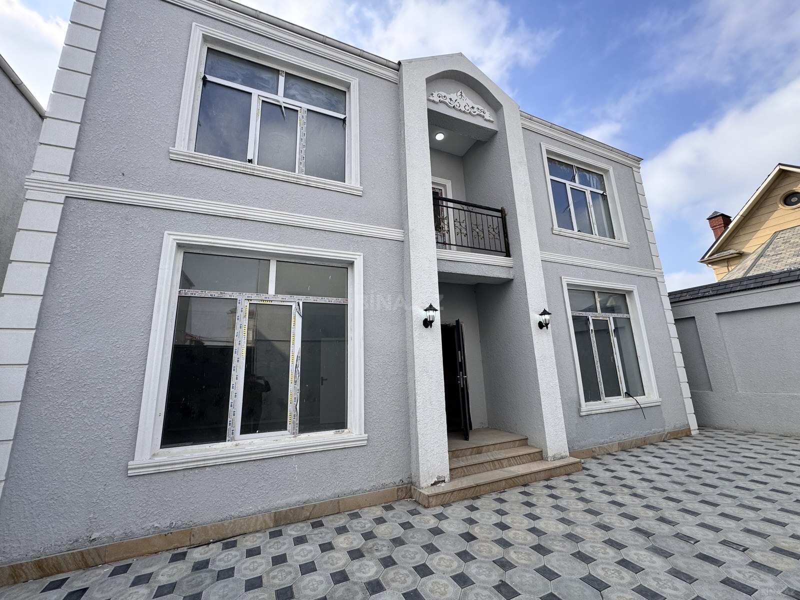 - Girişdə pilləkanlı eyvan, döşəmə tam metlax/çiçəkli daşla.
