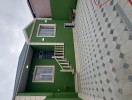 - Fasadı yaşıl rəngli dekorativ suvaqla işlənib, dam örtüyü metal/profil.