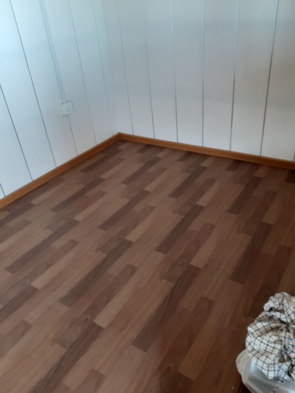- Ev/konteyner: daxili plastik/laminat divar örtüyü və taxta naxışlı döşəmə. Pəncərələrdə barmaqlıq. Elektrik çəkilişi mövcuddur (divarda rozetka və kabel kanalı görünür).
