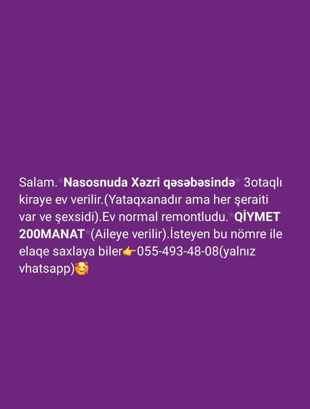 Ev Ayrıca (Отдельный). Ev sırf ayrıca (yəni evin sahibi ilə əlaqəsi yoxdur) evdir. Uzun müdət verilir. Babək prospekti, 8 noyabr prospekti və Xəzər Tv yaxındı.Evin düz önündən 32,30,22,15 marşrutlar keçir. Xalqlar metrosundan və Xətai metrosundan 10 dəqiqə aralı. Xətai ray. NZS q. olan yeni təmirli, hər şəraiti internet (Wi-Fi), paltaryuyan, soyuducu, kombi, qızdırıcı, kuxna mebili, yataq və əşyalı olan 3-otağlı həyət evi kirayə verilir. Evin qabaqında öz həyəti var. Qaz, İşıq, Su