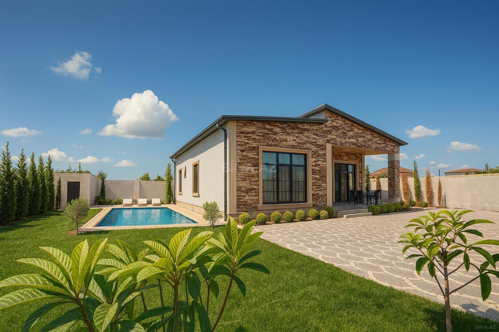 Buzovna qəsəbəsində 3 yatağ otağı 1 böyük salon əlavə olarağ həyətdə bisetka yay mətbəxi manqal var havuz var filterlidir