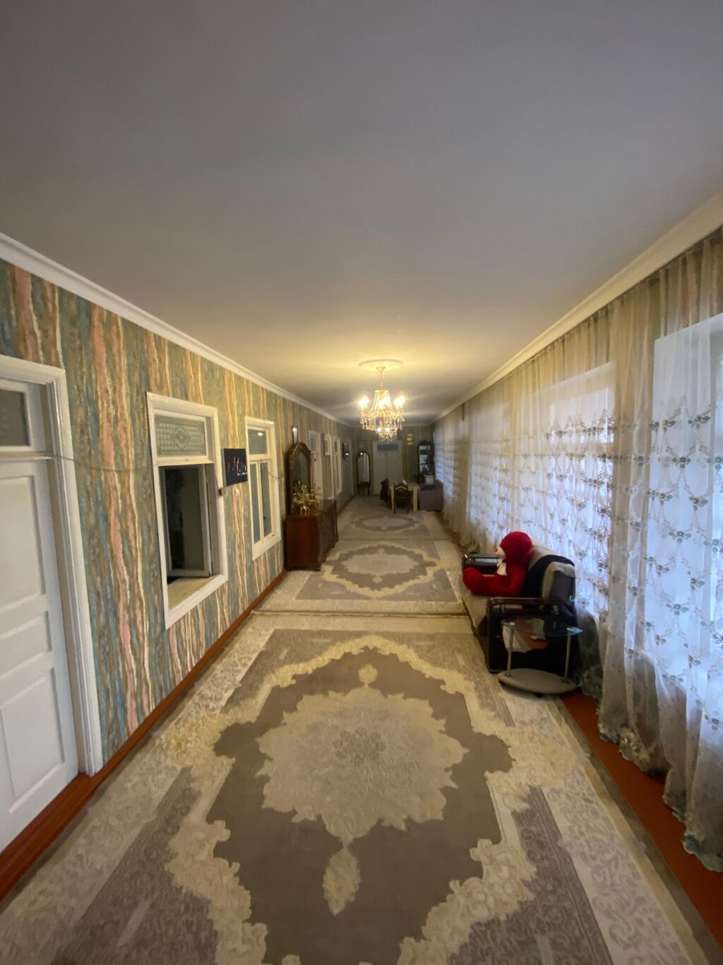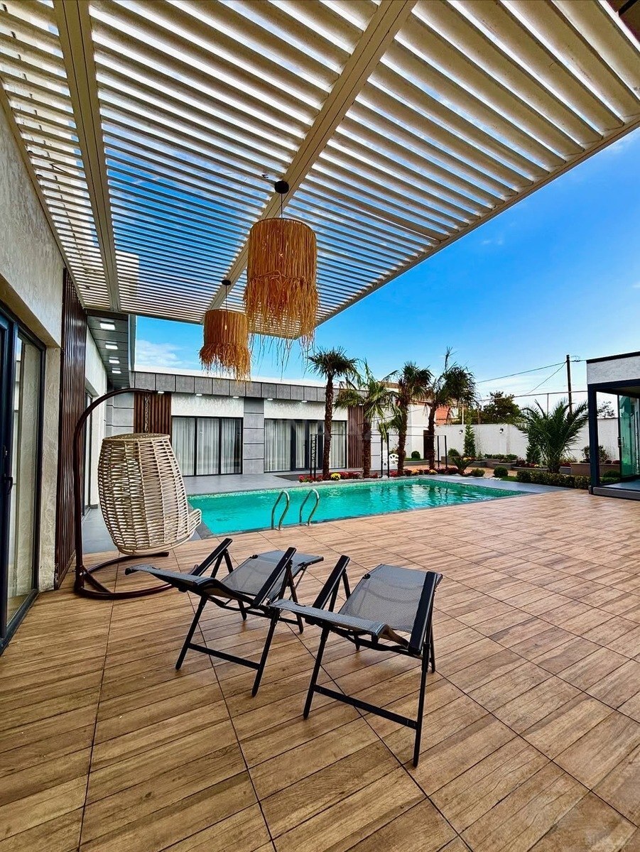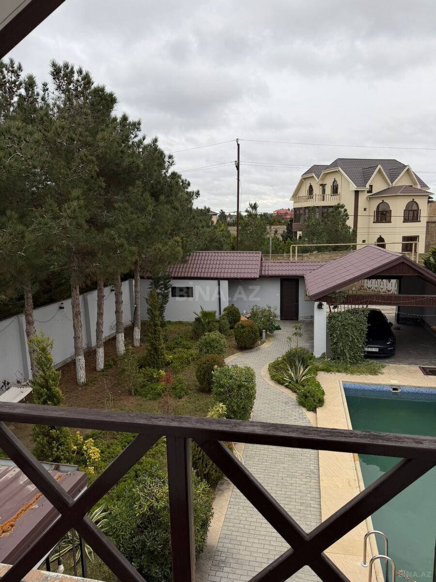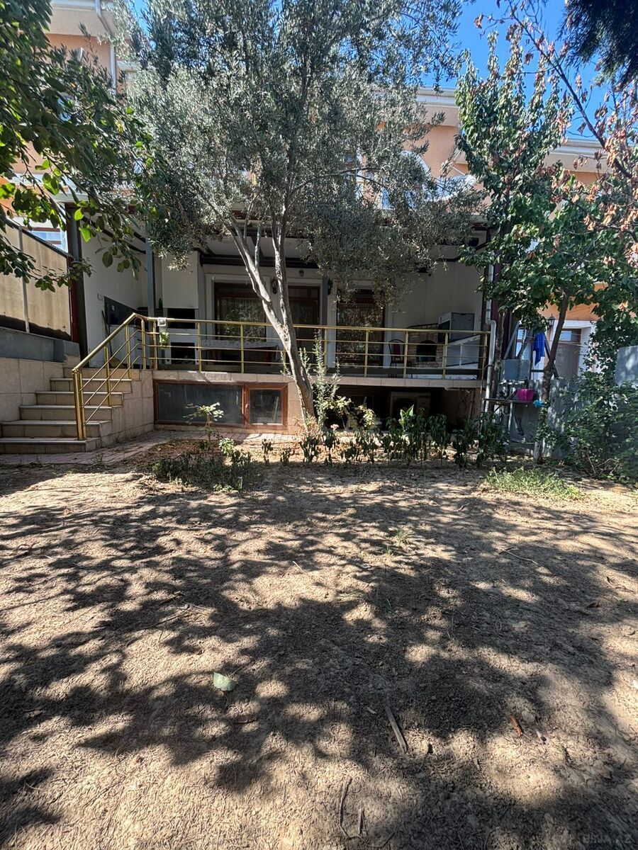 Həyət evi, yaşıllıqla əhatə olunmuş geniş həyəti və rahat yaşayış sahəsi təklif edir. Evin fasadı açıq rəngdə, damı isə tünd rəngdədir. Həyətdə daş döşəməli sahə, taxta masa və oturacaq dəsti mövcuddur ki, bu da açıq havada yemək və istirahət üçün əlverişlidir. Yaşıllıqlar və bitkilər həyətə təbii və canlı görünüş verir. Daxili hissədə zolaqlı divar kağızı olan dəhliz, tünd rəngli qapılar və döşəmədə böyük naxışlı xalça var. Tavan hissəsində müasir üslubda asma lampalar quraşdırılıb. kiraye verlir usaqli ayleye verilmir