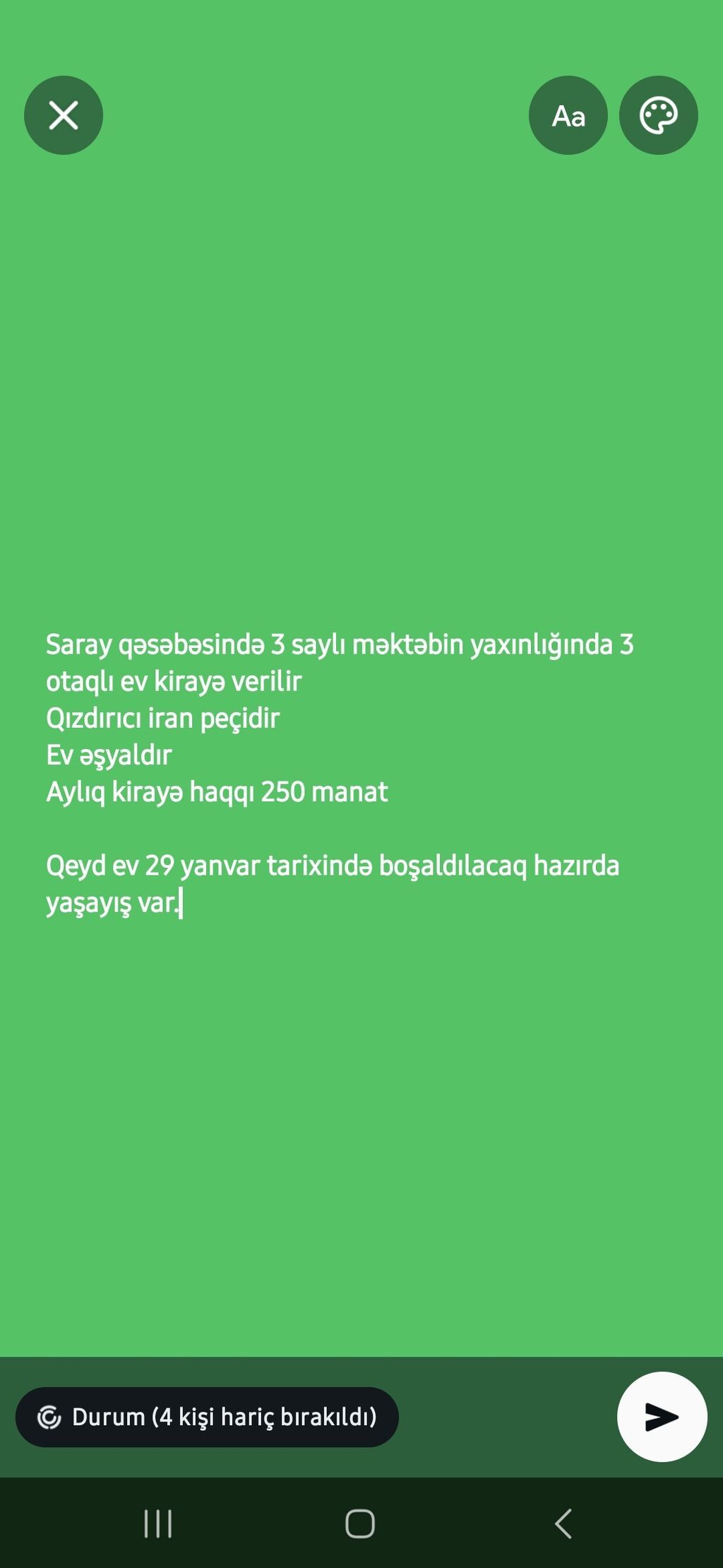Hovsan buta market terefde heyet evi bir iri otaq kiraye verilir.Heyetde 2 aile olacaq biri qohumdu biride axtarilir ewyalidi tekce SOYUDUCU yoxdu komunali ozu verecek qiymet 220 manat EV AYIN 25 BOWALIR