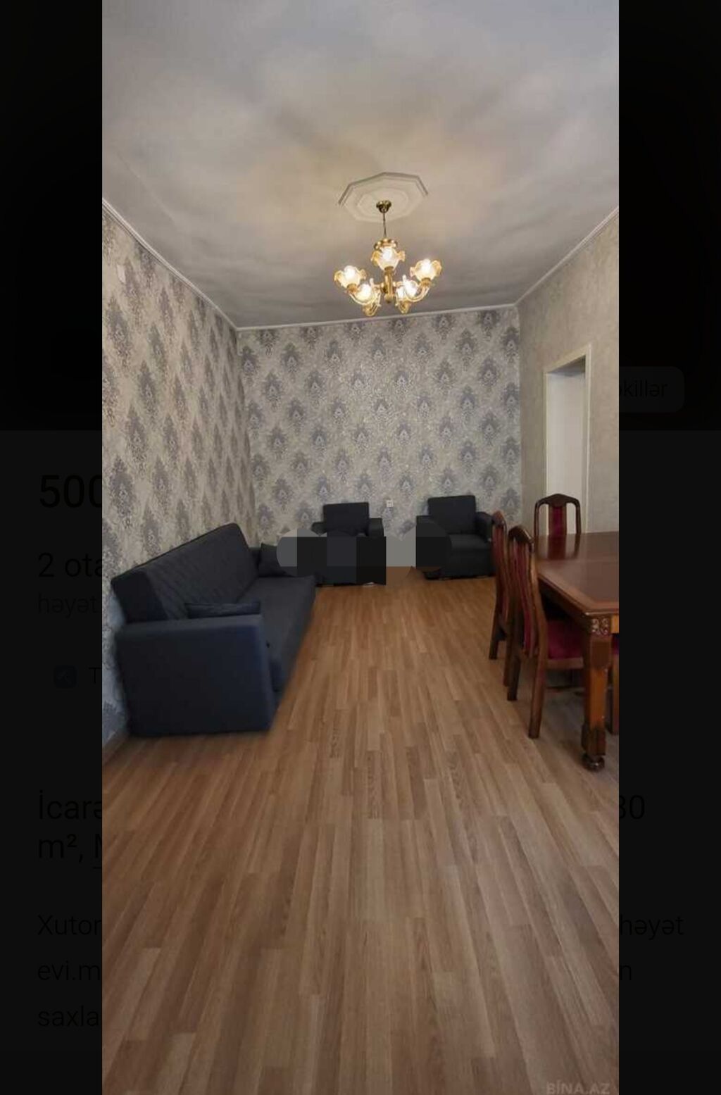 - Döşəmə və interyer: otaqlarda laminat döşəmə, taxta elementlər, tavan karnizləri, divar lampaları.
