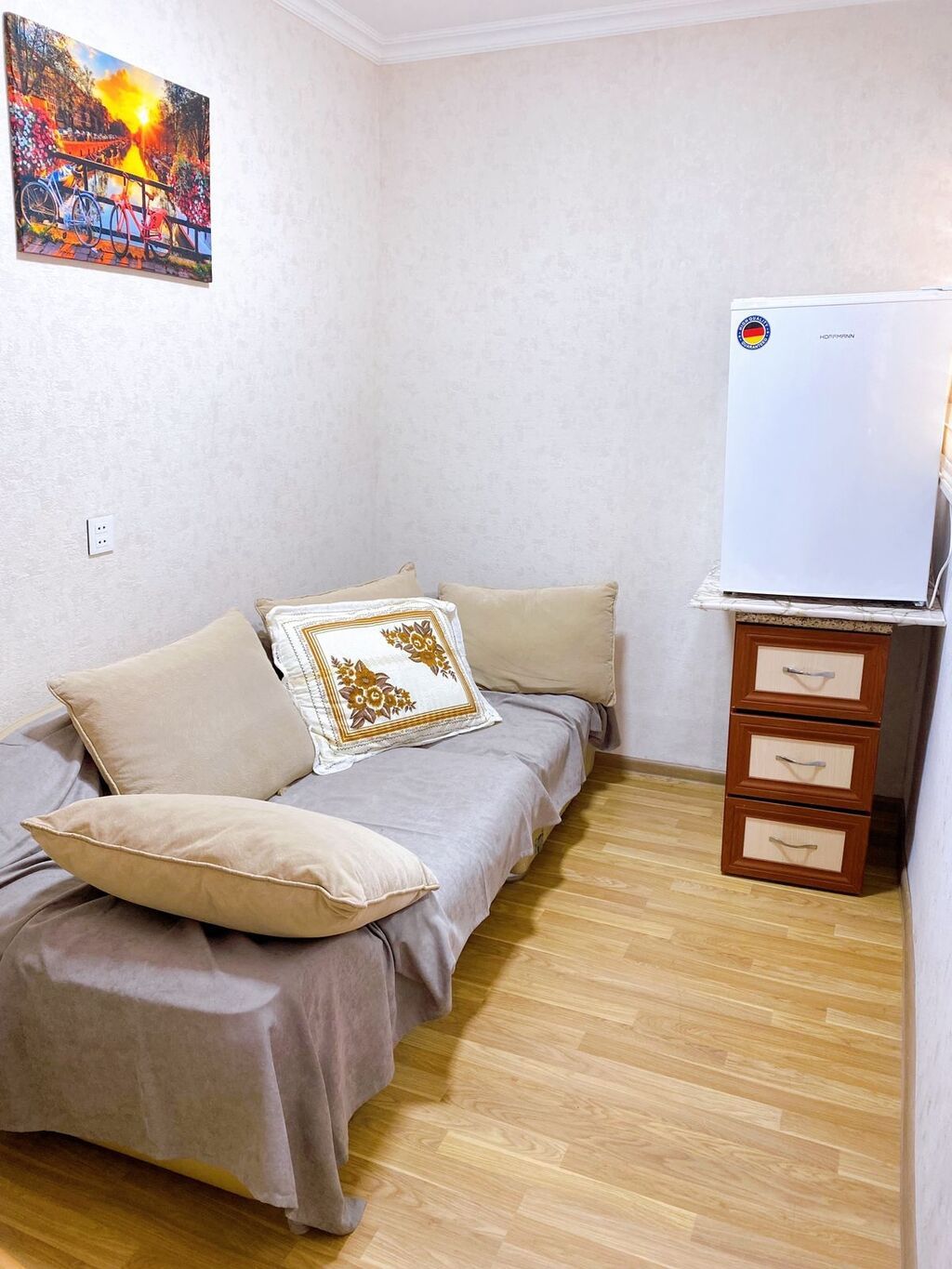- Otaq: divan/çarpayi, yastıqlar, komod, dekorativ tablo