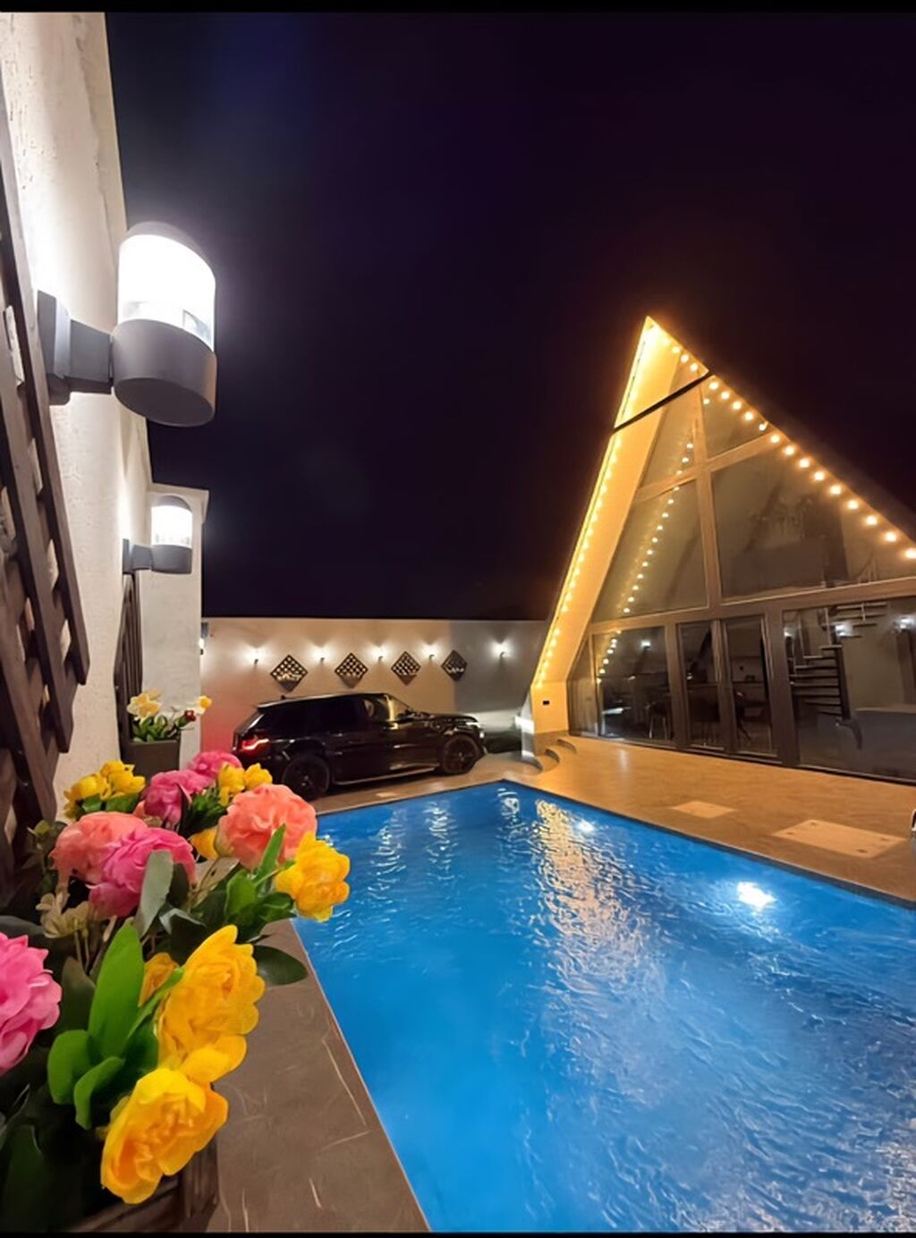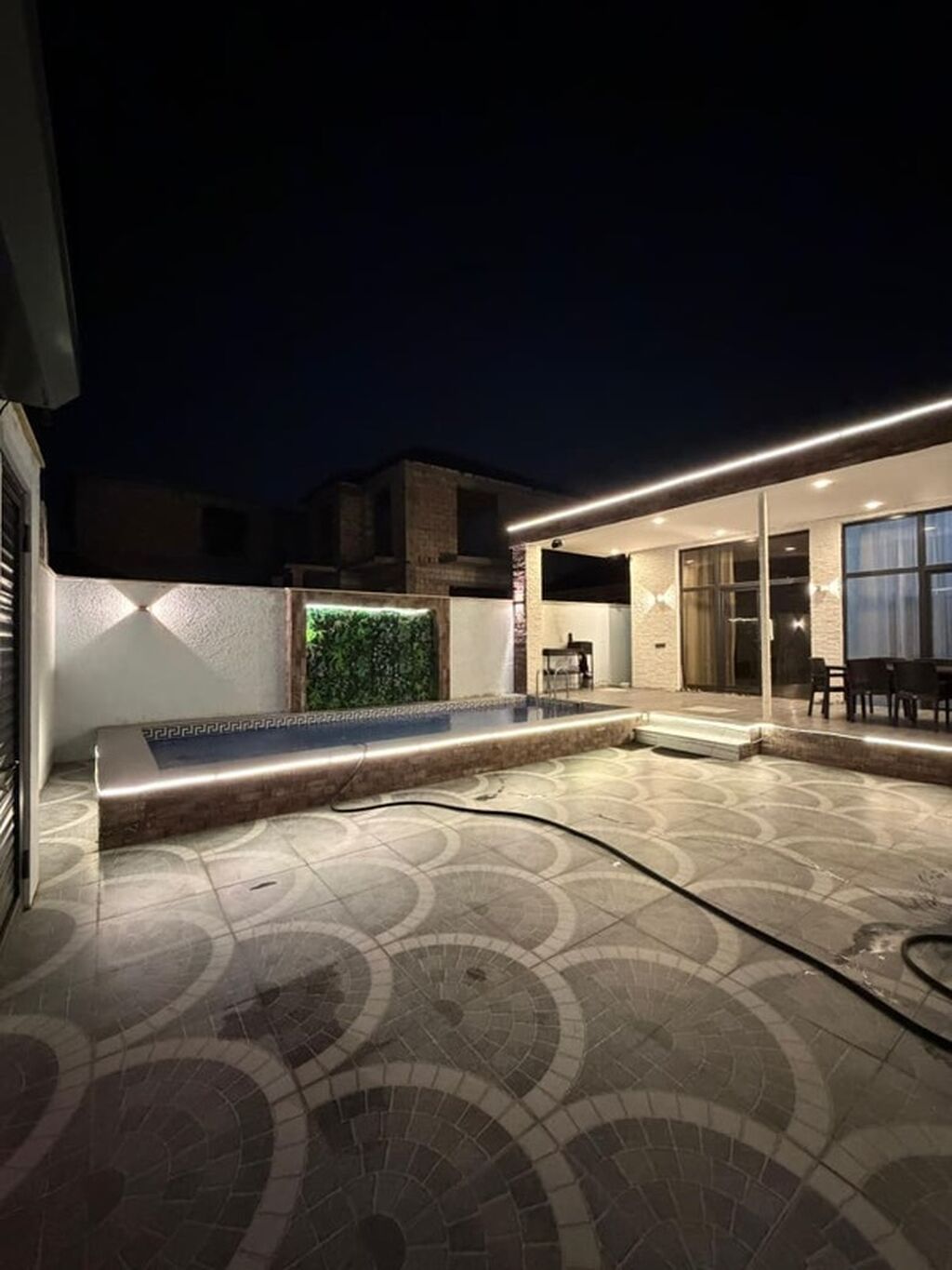 - Aydınlatmalı açıq hovuz: dərinlik pilləkəni, dekorativ LED işıqlar, divara proyeksiya ekranı (Netflix, YouTube, Google Play, Chrome girişləri görünür).