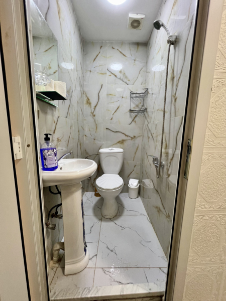 - Hamam/tualet: tam kafelli, asma tavan, havalandırma pəncərəsi, duş üçün çıxış, asılqan və rəflər, unitaz.