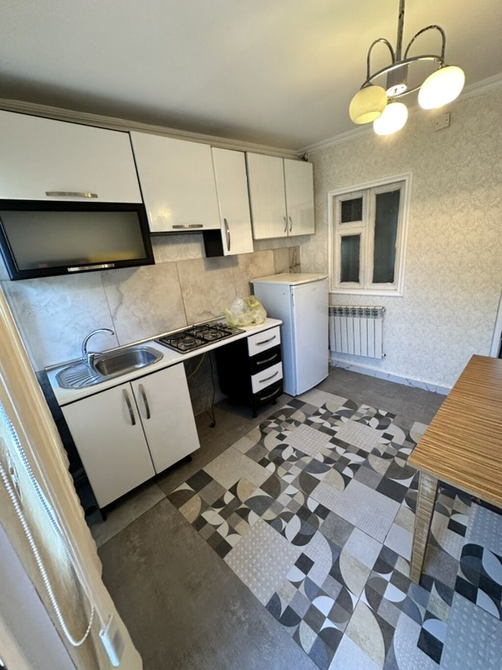 • Mətbəxdə asma və alt şkaflar, 2 gözlü qaz plitəsi, soyuducu, mətbəx lavabosu, stol
