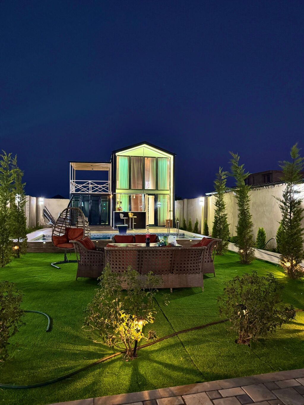 - Həyət: keramika plitələrlə üzlənmiş kvadrat formalı hovuz, meyvə ağacları və yaşıllıq.