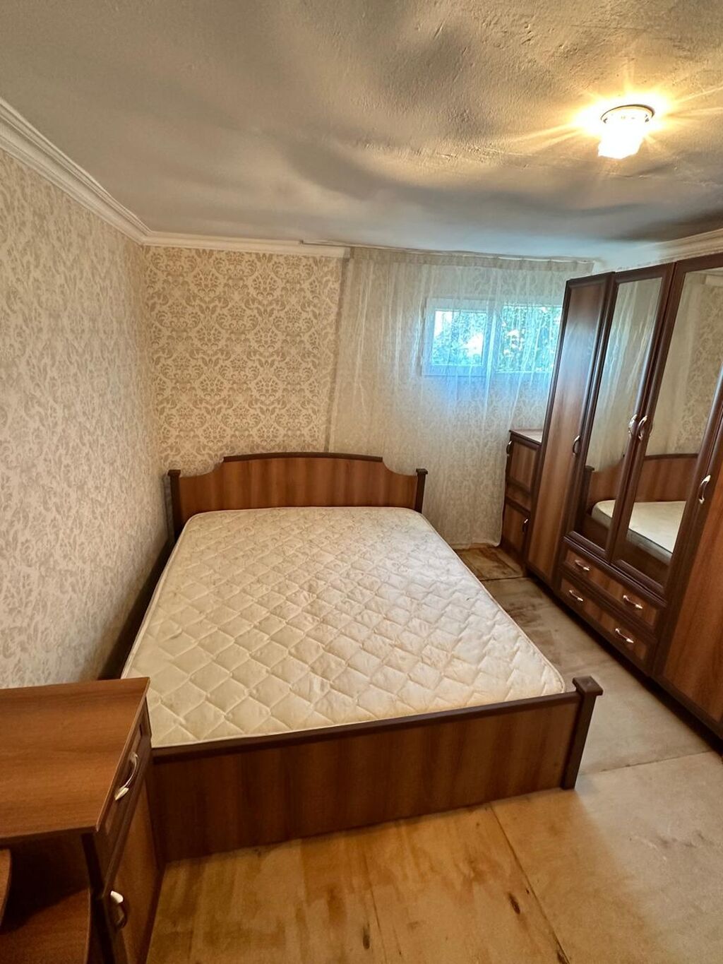 - Yataq otağı: iki nəfərlik taxta çarpayı (tünd ağac rəngi), şkaf-kupe tipli böyük qarderob güzgülü qapılarla, əlavə rəf və şkaf bölmələri.