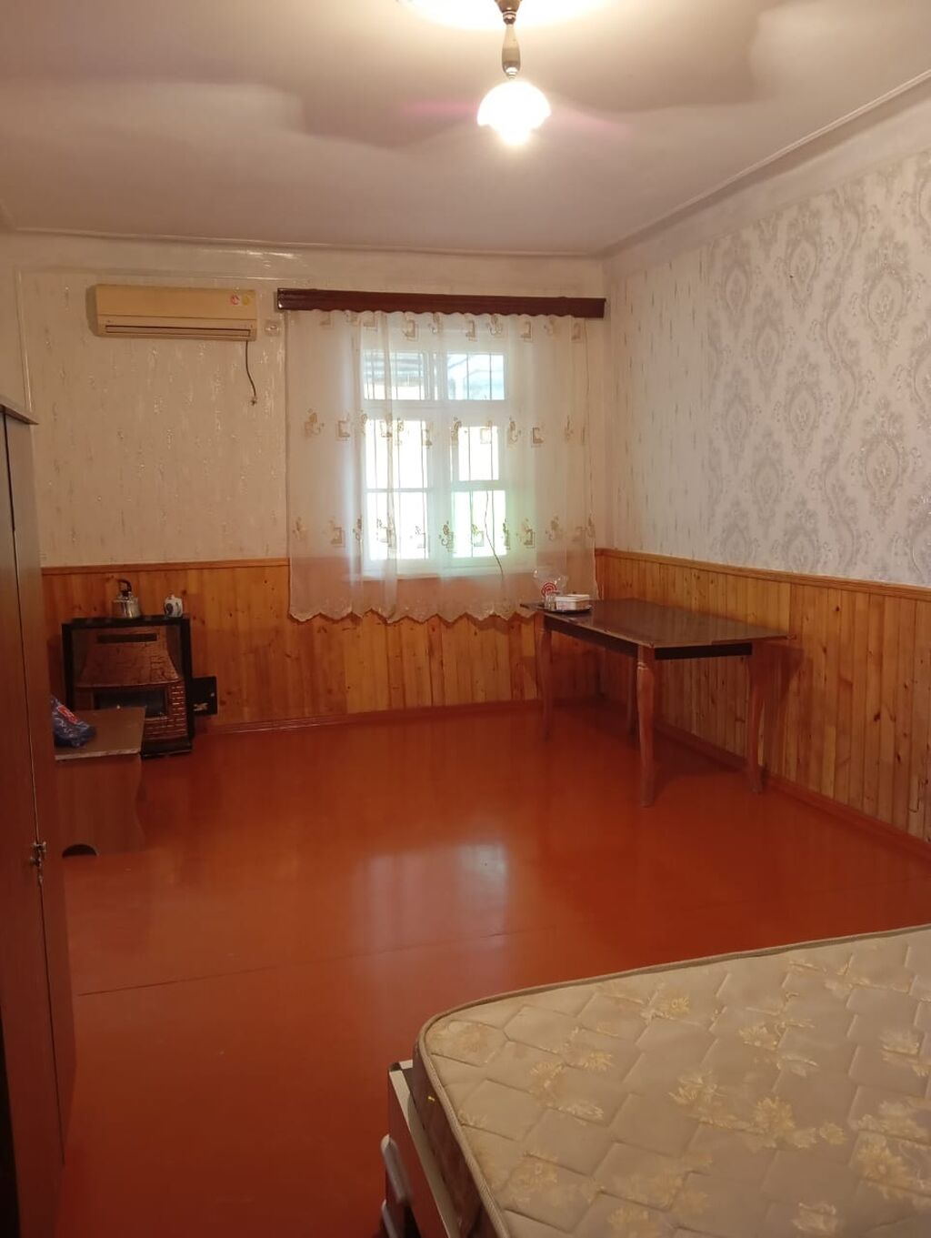 Ev kamsamol dairəsində yol qırağında yerləşir əşyalı verilir təkcə TV yoxdu gələn öz televizorun getirsin, Krosno aparatı və antenası var.Koroglu metrosuna maşınla 5 dəq yoldu.Evdə nəmişlik var deyə dəyərindən ucuz verilir.Usaqli adam götürmürük.