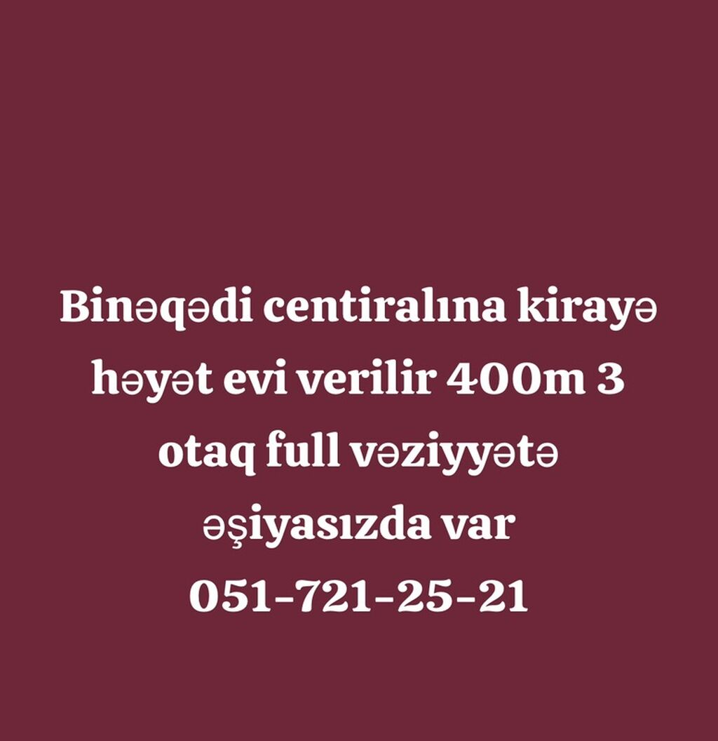 Binəqədi rayonu,Gülməmməd Ramazanov küc,Mərkəzi Binəqədi (Sentralni) OBA Marketin yanında ,0.5 kv.m həyəti,3otaqli ev kirayə verilir.Evdə işıq,su, qaz daimidir, kombi var.Ev təzə təmir olunub.Təmirdən sonra yaşayış olmayıb. Ev Ancaq Ailəyə,tələbə və İşləyən xanımlara verilir. Qiyməti-500AZN-dir. Real müstəriyə aşağı yeri var. Mənzil səliqəli, baxımlıdır və hər bir otaq istifadə üçün hazırdır. Mənzil butun nov vacib avadanliqla təmin olunub . Mənzilə heçnə lazım olmayacaq.Gir yaşa. ...