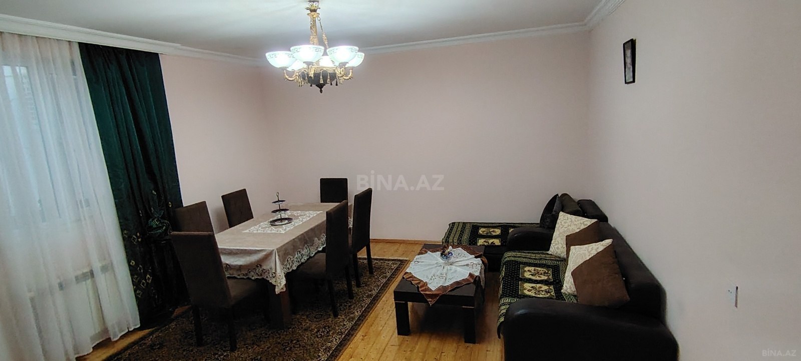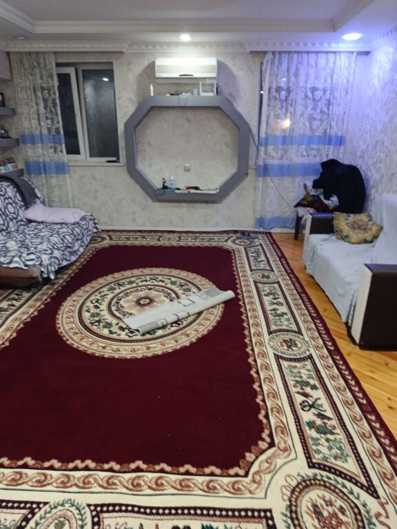 - Geniş, işıqlı zal: iri naxışlı xalça, iki divan, pərdələr, dekorativ niş, kondisioner.