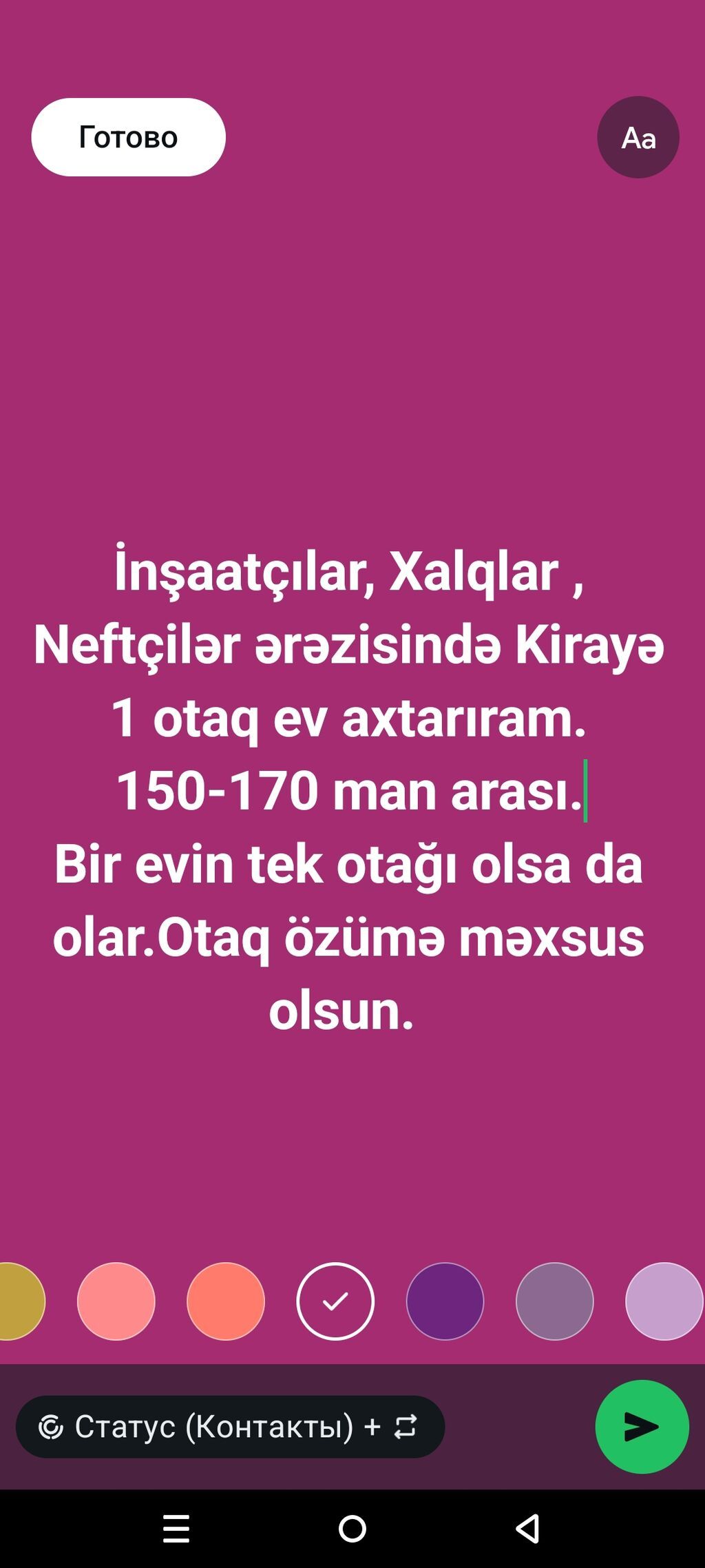 Yasamal rayonu , metronun İnşaatçılar və 20 Yanvar stansiyalarına təxminən 12 dəqiqə piyada məsafədir , 2 N - li tibb kolleci ( 2 N - li tibb texnikumu ) yaxınında , Leninqrad layihəli binada hər bir şəraiti və əşyaları olan 1 dən 2 yə düzəlmə mənzil kirayə verilir. Mənzil konbi sistemi ilə təchiz olunub. Binanın tam yanında avtobusların dayanacağı var. Binanın tam yanında bütün infrostrukturlar var. Mənzil yalnız və yalnız 2 və ya 3 nəfər tələbə qızlara verilir. Xahiş olunur qeyri şəxslər narahat etməsin. Mənzilin aylıq kirayə haqqı - 500 manat SON. Ofis xidmət haqqı 30 %. Yazılan şərtlərlə tam razı olmayanlar narahat etməsin. VatsApp da aktifdir