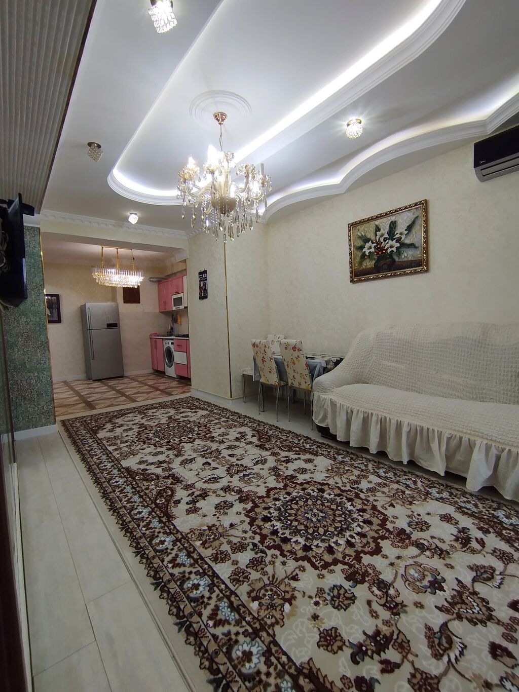 - Geniş və işıqlı zal: pəncərə boyu tül pərdələr, çilçıraq, divanda dekor yastıqlar, divara quraşdırılmış TV yeri, kondisioner.