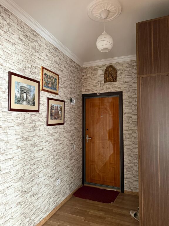 Mənzil – işıqlı və geniş dəhlizli, taxta fakturalı laminat döşəmə, tavan karnizləri və tünd rəngli interyer qapıları ilə. Planlama rahatdır: dəhlizdən bir neçə otağa giriş var, otaqlarda böyük pəncərə, radiator istilik sistemi görünür. Kondisioner quraşdırılıb. Giriş hissəsində asılqan/ayaqqabılıq üçün yer ayrılıb, divarda internet/routernin çıxışı mövcuddur. Sanitar qovşağı: divardan asma rezervuar düyməli unitaz, divara bərkidilən əl-üz yuma lavabosu, güzgülü şkaf, duş üçün qarışdırıcı və bide duşu. Divarlar tam kafel, santexnika xəttləri gizli çəkilib. Ümumi xüsusiyyətlər: - Laminat döşəmə - Tünd ağac rəngli qapılar - Tavan plintusları - Kondisioner - İstilik radiatorları - Tam kafelli ...