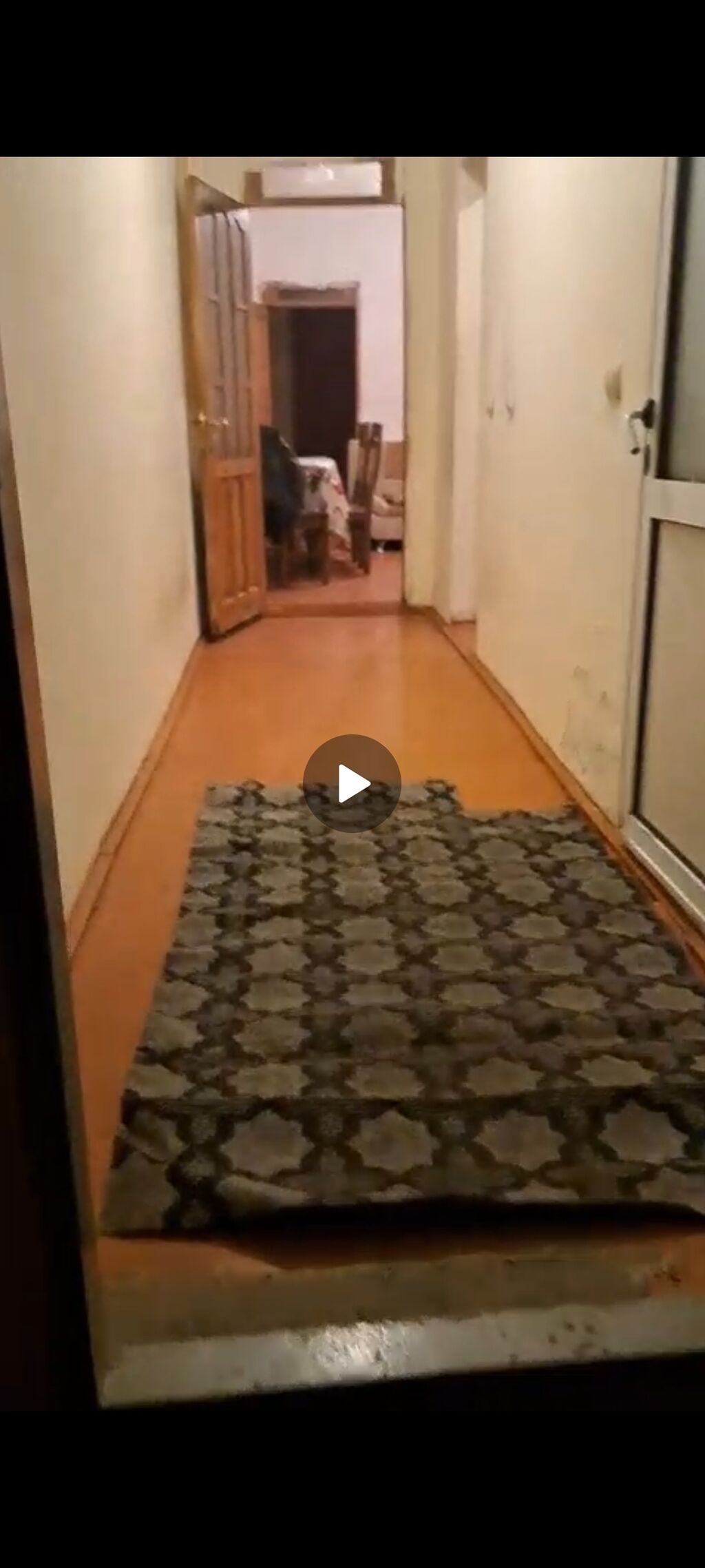 - Zal: geniş işıqlı otaq, künc divan, TV stendi və televizor, asma tavan və dekorativ çilçıraq, iri pəncərə, qara qalın pərdələr və tüllər, yemək zonası (dördnəfərlik masa-stul dəsti), döşəmədə xalça.