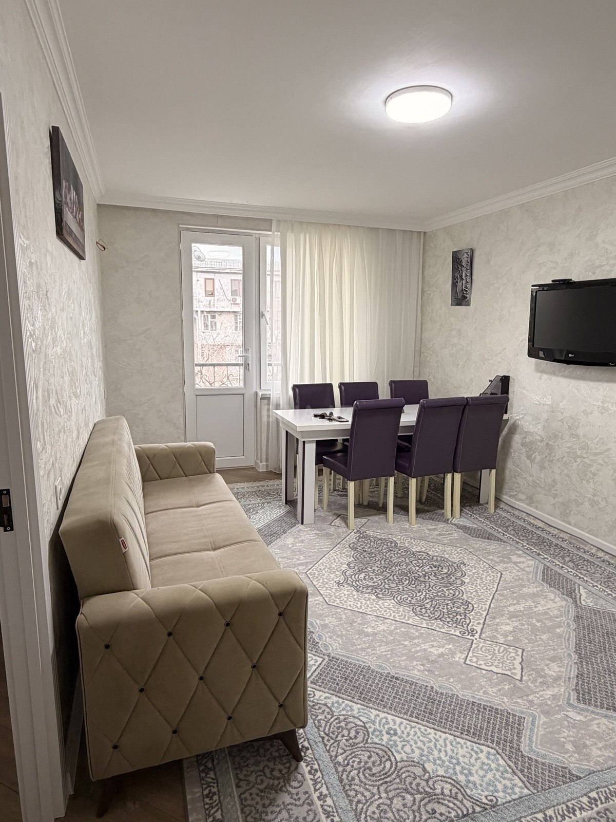 - Geniş qonaq otağı: divan, 6 nəfərlik yemək masası və stullar, pərdə və xalça ilə tamamlanıb. Tavan karnizi və dekorativ rozetka, laminal döşəmə.