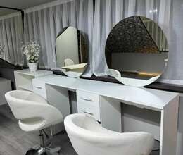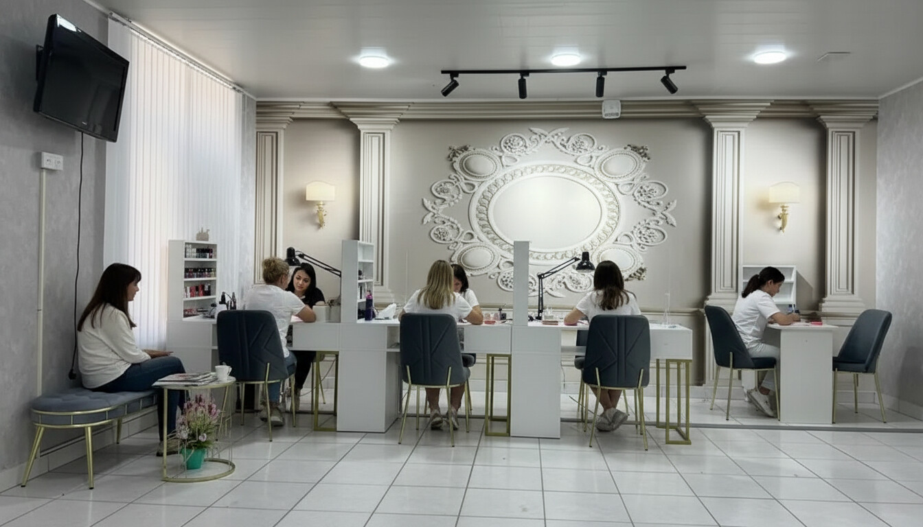 Gözəllik/Manikür Studiyası üçün icarəyə uyğun tam təchizatlı iş yerləri - Zövqlü, işıqlı interyer: klassik dekorlu divar panelləri, hündür tavan, geniş vitraj pəncərə, gündüz işığını bol alan məkan. - 4+ manikür stansiyası: hər postda masa, arakəsmə, rahat yumşaq kreslo, masaüstü işıqlandırma. - Əlavə iş sahəsi: ayrıca masa və kreslo ilə əlavə künc. - Komfort və gözlənti zonası: yumşaq oturacaq, kofe/çay üçün kiçik stol, dekorativ bitkilər. - Saxlama və təşkilat: rəf və çekmecələr, lak və aksesuarlar üçün vitrin-rəf. - Peşəkar işıqlandırma: tavan spotları və rels üzərində projektorlar, divar braları ilə zonalı işıq. - Təmiz və əlverişli mərtəbə planı: keramik döşəmə, asan təmizlik. - Texnik ...