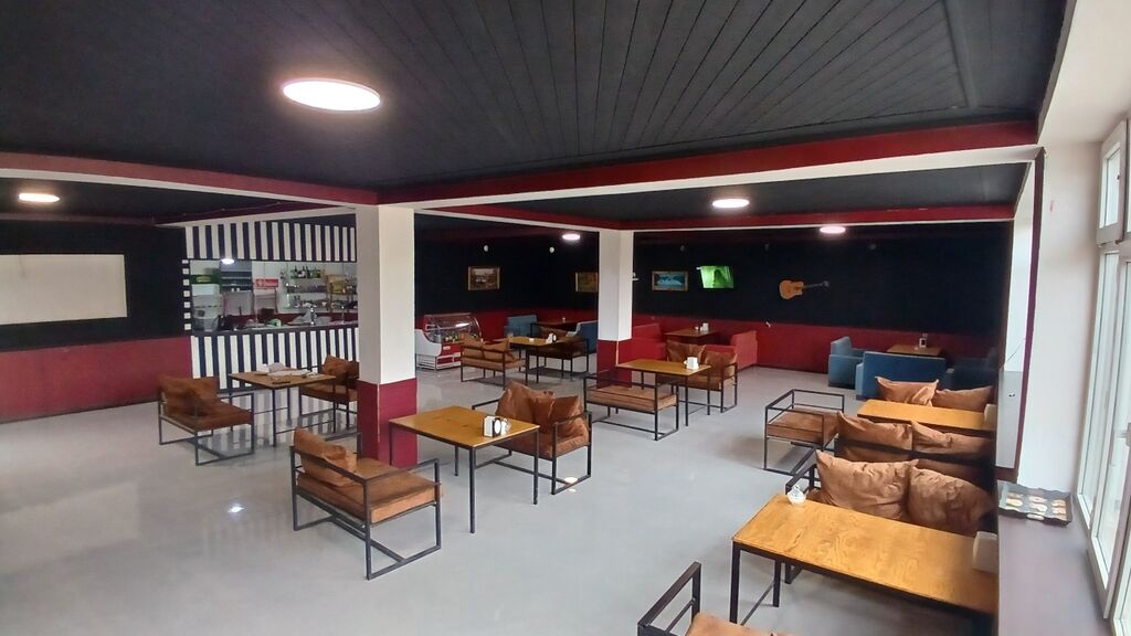 Geniş və işıqlı interyerə malik rahat kafe-lounge məkanı. Xüsusiyyətlər: - Açıq planlı zal, böyük vitraj pəncərələr və yüksək tavan - Müxtəlif oturma zonaları: rahat divan və kreslolar, iki və dörd nəfərlik masalar - Minimalist sənaye üslubunda mebel, taxta üstlü masalar, yumşaq yastıqlar - Divar boyu dekorativ tablolar və musiqi temalı elementlər - LED dairəvi tavan işıqları, bərabər və yumşaq işıqlandırma - TV panelləri ilə təchiz olunmuş istirahət sahələri - Bar/kassa zonası və vitrini olan servis hissəsi - Təmiz, parlaq döşəmə örtüyü; sütunlu açıq plan sayəsində sərbəst masa düzümü - Geniş keçidlər, rahat giriş-çıxış İstifadə üçün uyğundur: - Sakit görüşlər, dost toplantıları, əyləncə ...
